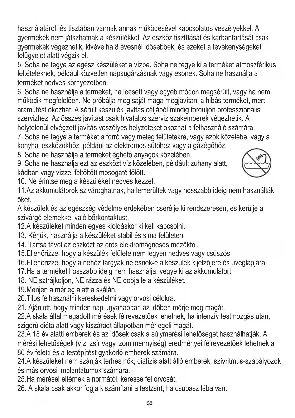 konyhai eszközökhöz, például az elektromos sütőhez vagy a gázégőhöz. 16.Ellenőrizze, hogy a nehéz tárgyak ne esnek-e a készülék kijelzőjére és üveglapjára. kádban vagy vízzel feltöltött mosogató fölött. 23.A 18 év alatti emberek és az idősek csak a súlymérési lehetőséget használhatják. A mérési lehetőségek (víz, zsír vagy izom mennyiség) eredményei félrevezetőek lehetnek a 80 év feletti és a testépítést gyakorló emberek számára. 24.A készüléket nem szánják terhes nők, dialízis alatt álló emberek, szívritmus-szabályozók és más orvosi implantátumok számára.