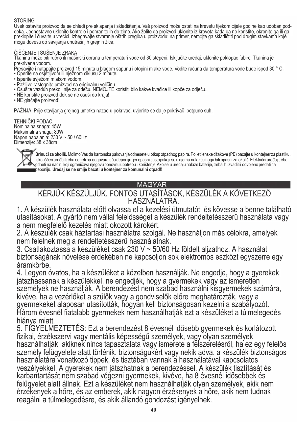 19. Ne használja a lapot, ha nedves vagy nedves. Hagyja a lapot lazán lélegzett helyen,