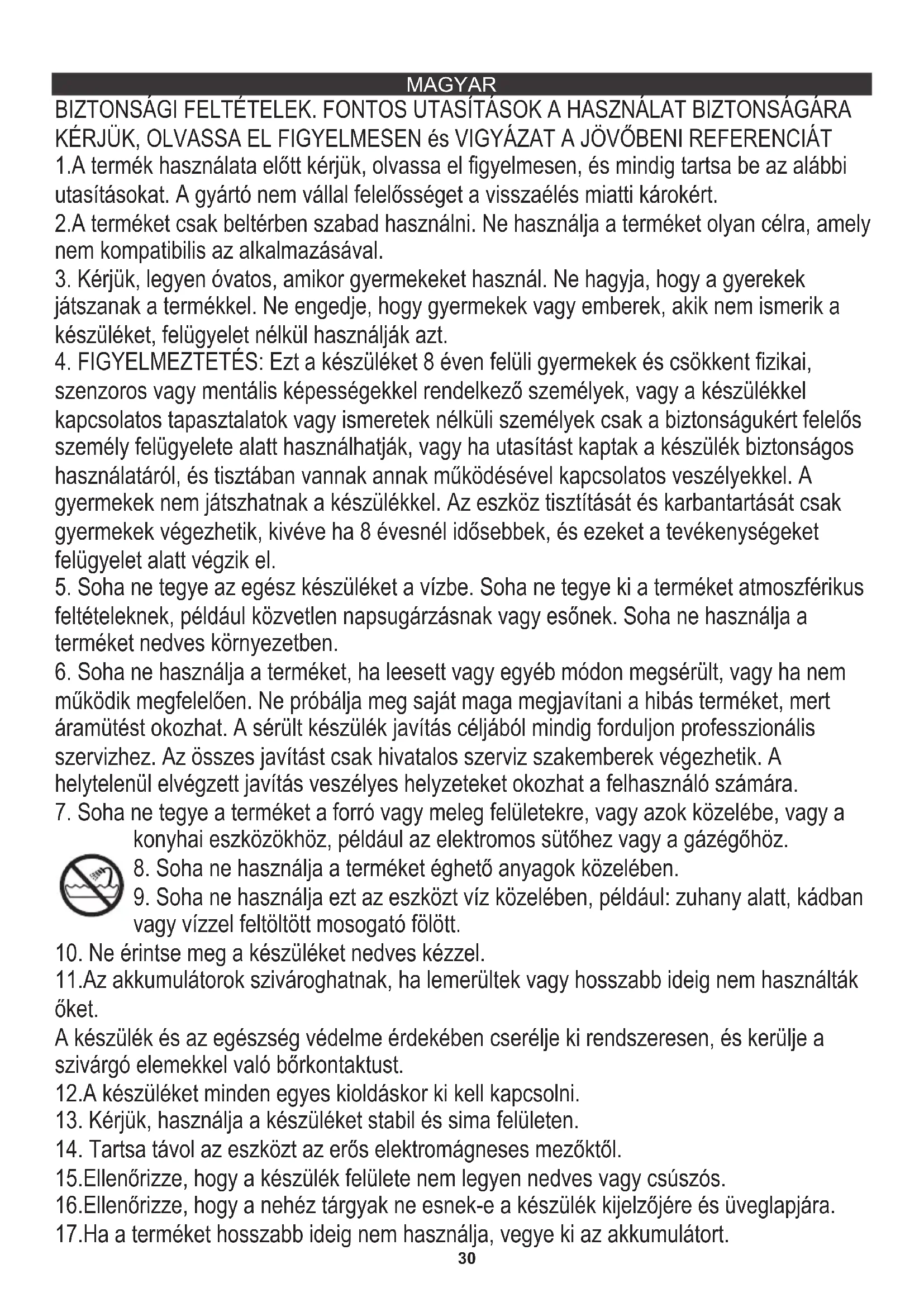 9. Soha ne használja ezt az eszközt víz közelében, például: zuhany alatt, kádban