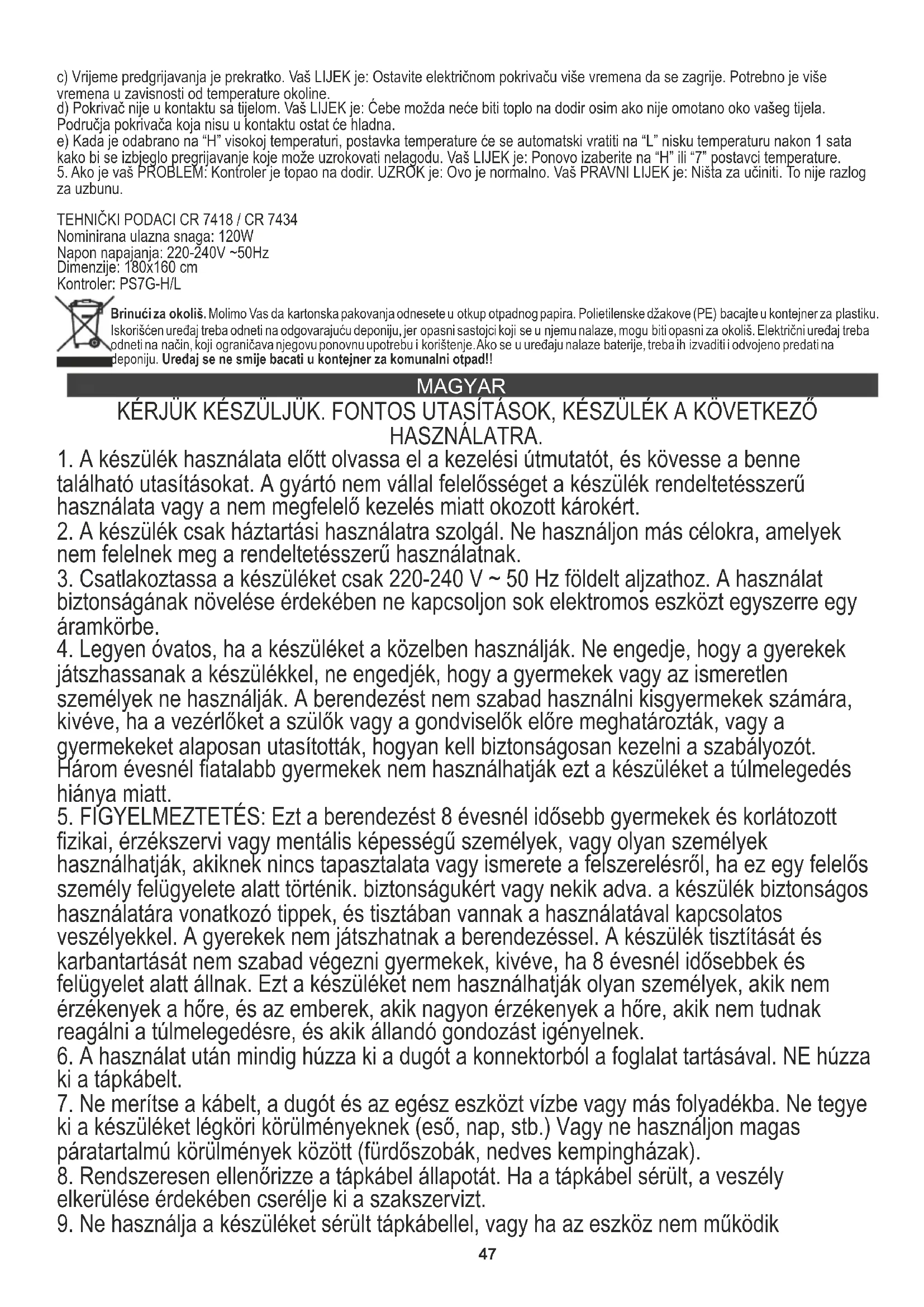 készülék rendeltetésszerű használatát használja. Ha a biztosíték elindul, a készülék leáll, a49 berendezést vissza kell küldeni a gyártónak vagy képviselőjének javításra. Termék: Elektromos véső takaró CR7418 / Cr7434 Ezt az elektromos takarót átfedő takaróként használják, az egyén tetejére kell helyezni, nem pedig alatta, vagy a felső lap tetejére kell helyezni, nem pedig a matracon. Ne tegye be a személy körül vagy alá. Laza maradjon, hogy ne tiltsa meg a felhasználó mozgását. Ne takarja le a szabályozót, és ne gyakoroljon nyomást a vezérlőre.