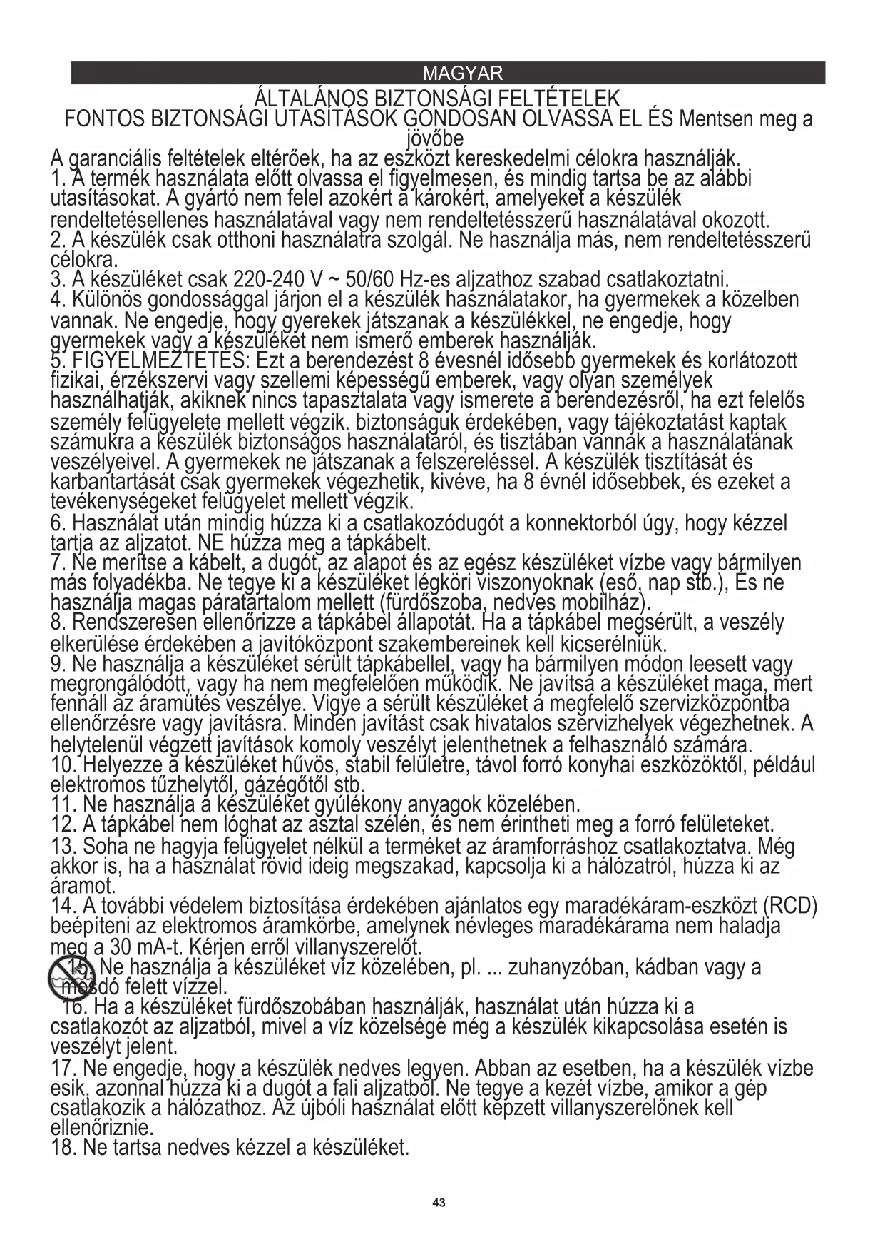 15. Ne használja a készüléket víz közelében, pl. ... zuhanyzóban, kádban vagy a