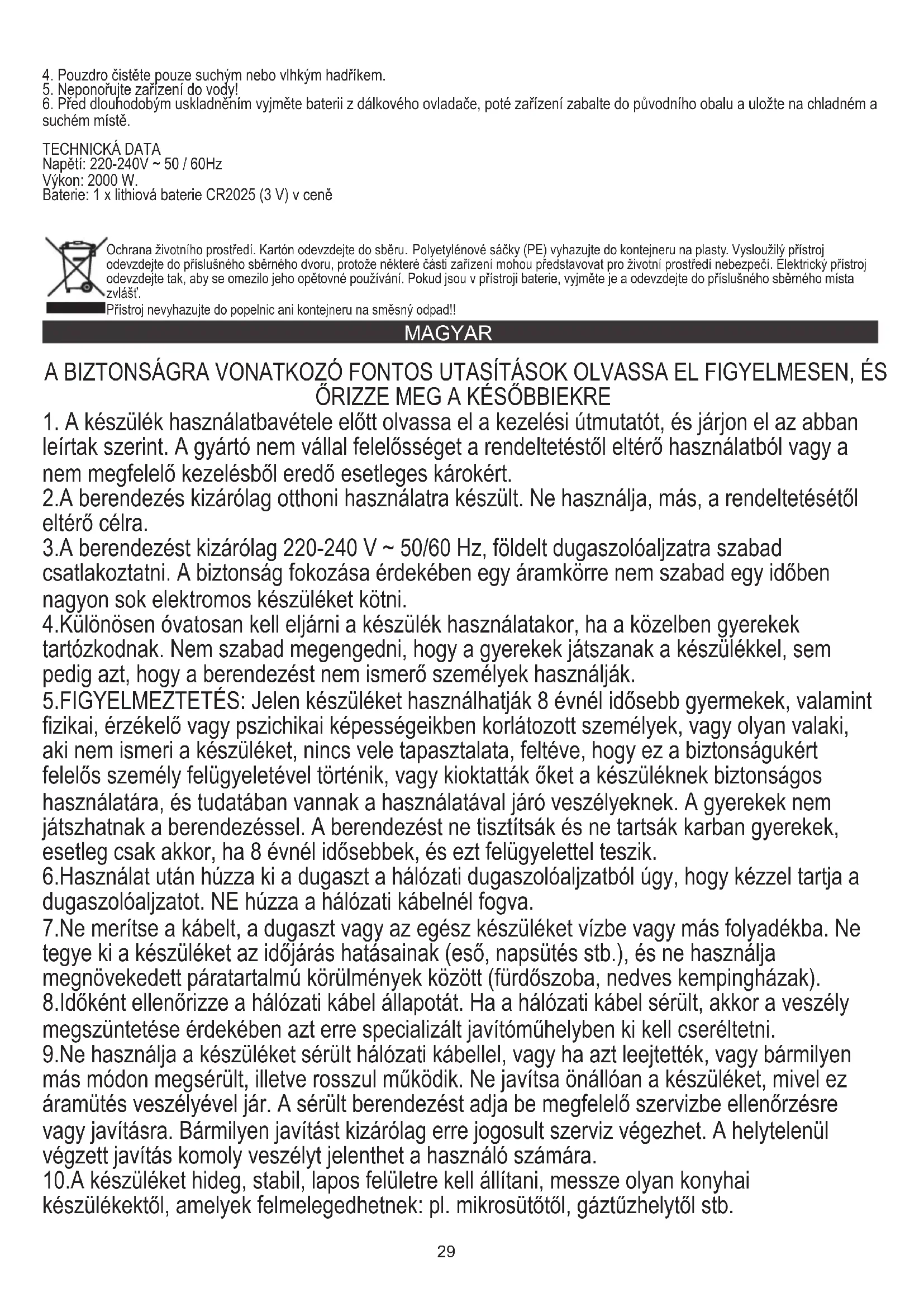 6. Před dlouhodobým uskladněním vyjměte baterii z dálkového ovladače, poté zařízení zabalte do původního obalu a uložte na chladném a suchém místě. TECHNICKÁ DATA Napětí: 220-240V ~ 50 / 60Hz Výkon: 2000 W. Baterie: 1 x lithiová baterie CR2025 (3 V) v ceně30 11.Ne használja a készüléket gyúlékony anyagok közelében. 12.A hálózati kábel nem lóghat az asztal szélén túl, vagy nem érhet forró felülethez. 13.Nem szabad felügyelet nélkül hagyni a bekapcsolt készüléket vagy tápegységet. 14.Plusz védelem érdekében ajánlott az elektromos áramkörbe 30 mA-t nem meghaladó névleges túláramra méretezett túláram-védőkapcsolót (RDC) kell beépíteni. Ezt villanyszerelőre kell bízni.