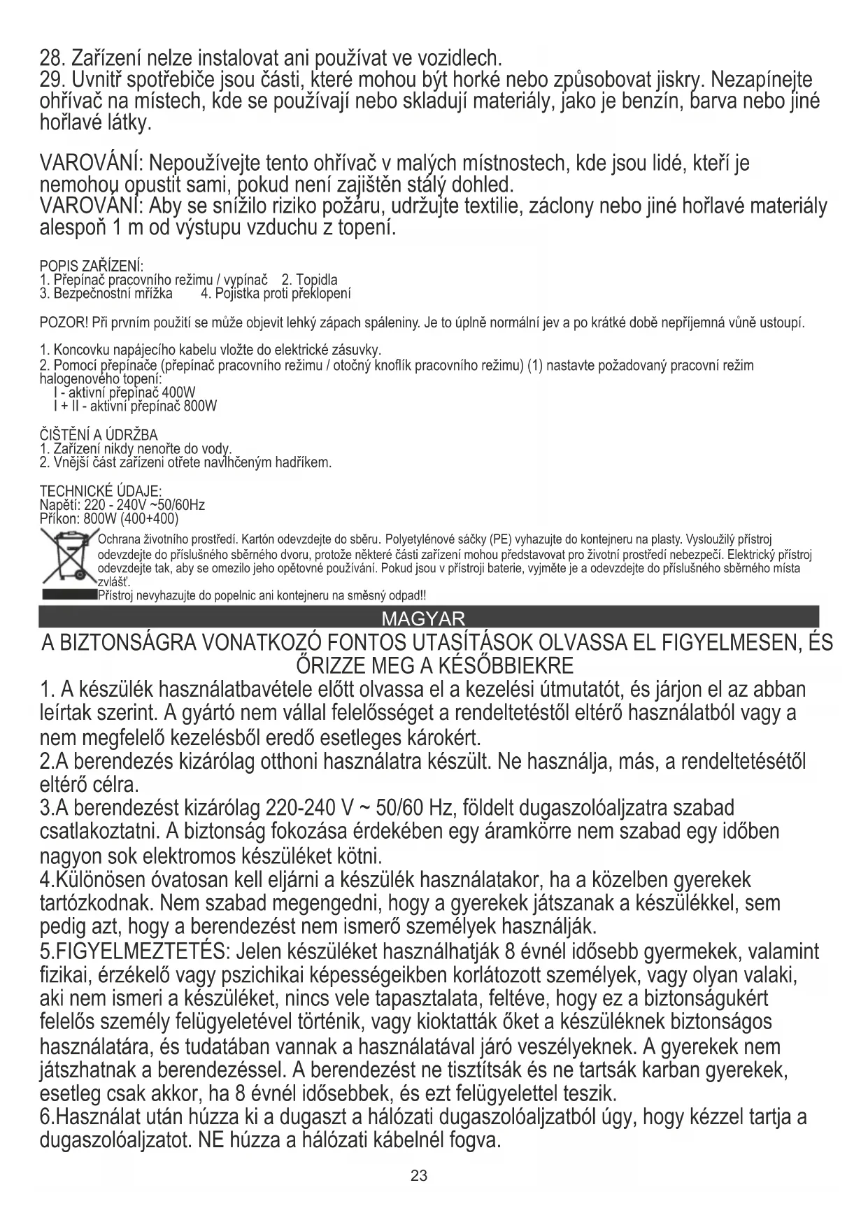 Tápfeszültség: 220 - 240V ~50/60-60Hz Teljesítmény: 800W (400+400) A környezet védelme érdekében kérjük külön karton dobozok és műanyag zsákokat és dobja őket a megfelelő hulladék közé. Használt készüléket kell eljuttatni a kijelölt gyűjtőhelyekre miatt veszélyes elemek alkatrészeket, amelyek hatással lehetnek a környezetre. Ne dobja a készüléket a közös szemétkosárba. BOSANSKI BEZBEDNOSNI USLOVI VAŽNA UPUTSTVA O BEZBEDNOSTI UPOTREBE MOLIMO VAS PAŽLJIVO PROČITAJTE I DRŽITE U BUDUĆOJ REFERENCI Uvjeti garancije su različiti ako se uređaj koristi u komercijalne svrhe. " 1.Prije upotrebe proizvoda pažljivo pročitajte i uvijek se pridržavajte sljedećih uputa. Proizvođač nije odgovoran za bilo kakvu štetu nastalu bilo kakvom zlouporabom. 2.Proizvod se koristi samo u zatvorenom prostoru. Ne koristite proizvod u bilo koju svrhu koja nije kompatibilna sa njegovom primenom.