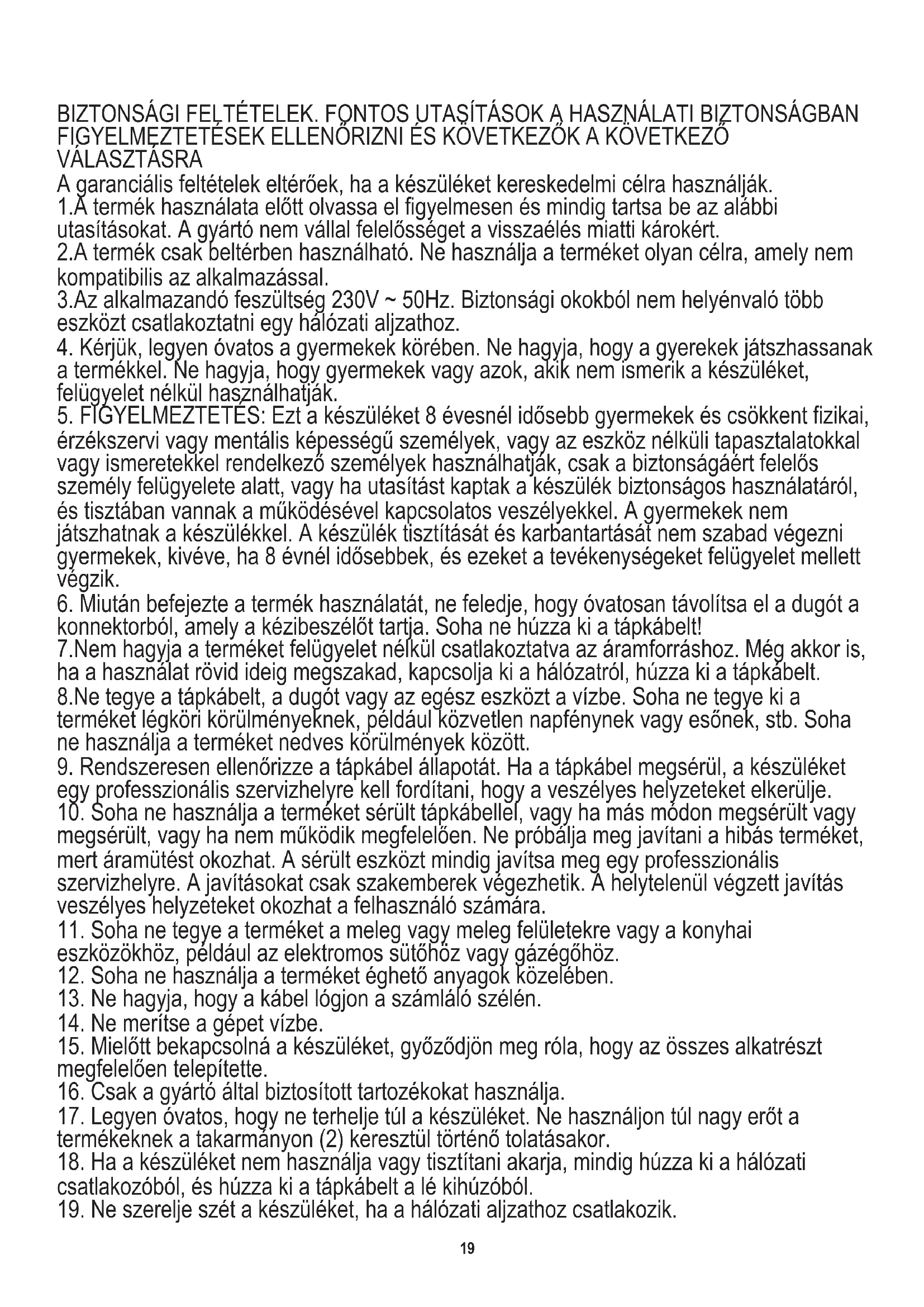 érzékszervi vagy mentális képességű személyek, vagy az eszköz nélküli tapasztalatokkal vagy ismeretekkel rendelkező személyek használhatják, csak a biztonságáért felelős személy felügyelete alatt, vagy ha utasítást kaptak a készülék biztonságos használatáról, és tisztában vannak a működésével kapcsolatos veszélyekkel. A gyermekek nem játszhatnak a készülékkel. A készülék tisztítását és karbantartását nem szabad végezni gyermekek, kivéve, ha 8 évnél idősebbek, és ezeket a tevékenységeket felügyelet mellett végzik. 7.Nem hagyja a terméket felügyelet nélkül csatlakoztatva az áramforráshoz. Még akkor is, ha a használat rövid ideig megszakad, kapcsolja ki a hálózatról, húzza ki a tápkábelt.