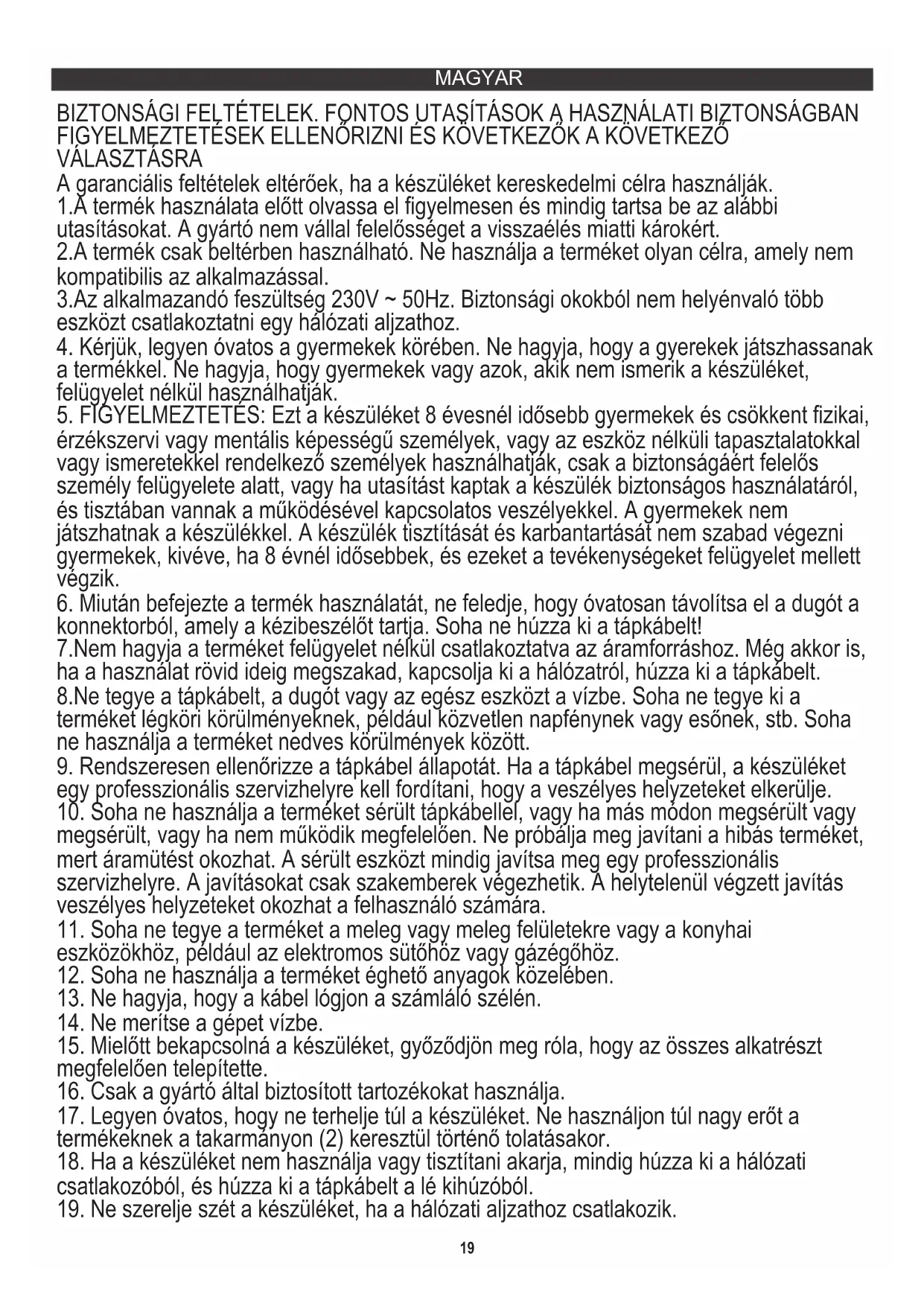8.Ne tegye a tápkábelt, a dugót vagy az egész eszközt a vízbe. Soha ne tegye ki a terméket légköri körülményeknek, például közvetlen napfénynek vagy esőnek, stb. Soha ne használja a terméket nedves körülmények között. A garanciális feltételek eltérőek, ha a készüléket kereskedelmi célra használják. 1.A termék használata előtt olvassa el figyelmesen és mindig tartsa be az alábbi utasításokat. A gyártó nem vállal felelősséget a visszaélés miatti károkért.