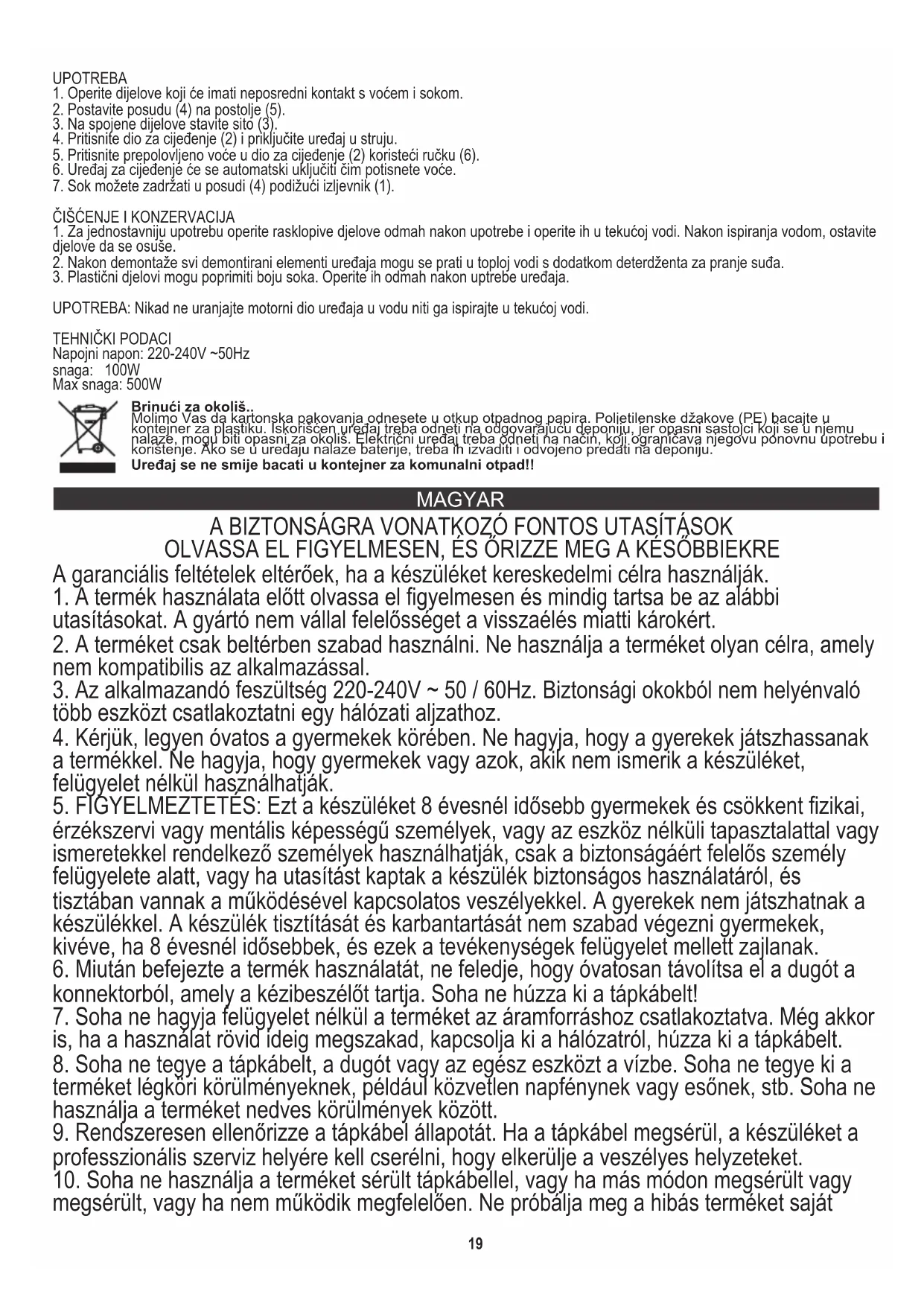 eszközökhöz, például az elektromos sütőhöz vagy a gázégőhöz. 1. A könnyebb tisztítás érdekében, minden használat után azonnal öblítse le folyó víz alatt a leszedhető részeket. Az öblítés után hagyja az alkatrészeket megszáradni. Tápfeszültség: 220-240V ~50Hz Teljesítmény:100W