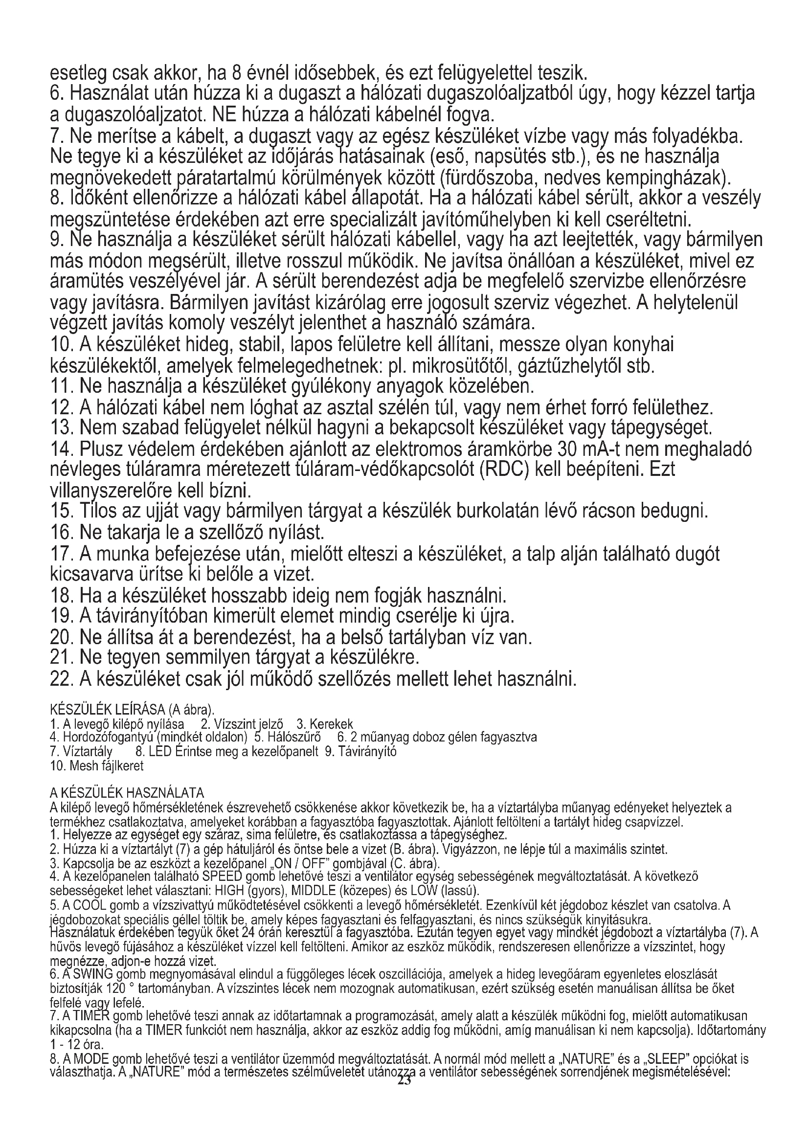 2. Húzza ki a víztartályt (7) a gép hátuljáról és öntse bele a vizet (B. ábra). Vigyázzon, ne lépje túl a maximális szintet. 8. A MODE gomb lehetővé teszi a ventilátor üzemmód megváltoztatását. A normál mód mellett a „NATURE” és a „SLEEP” opciókat is választhatja. A „NATURE” mód a természetes szélműveletet utánozza a ventilátor sebességének sorrendjének megismételésével: KÉSZÜLÉK LEÍRÁSA (A ábra).
