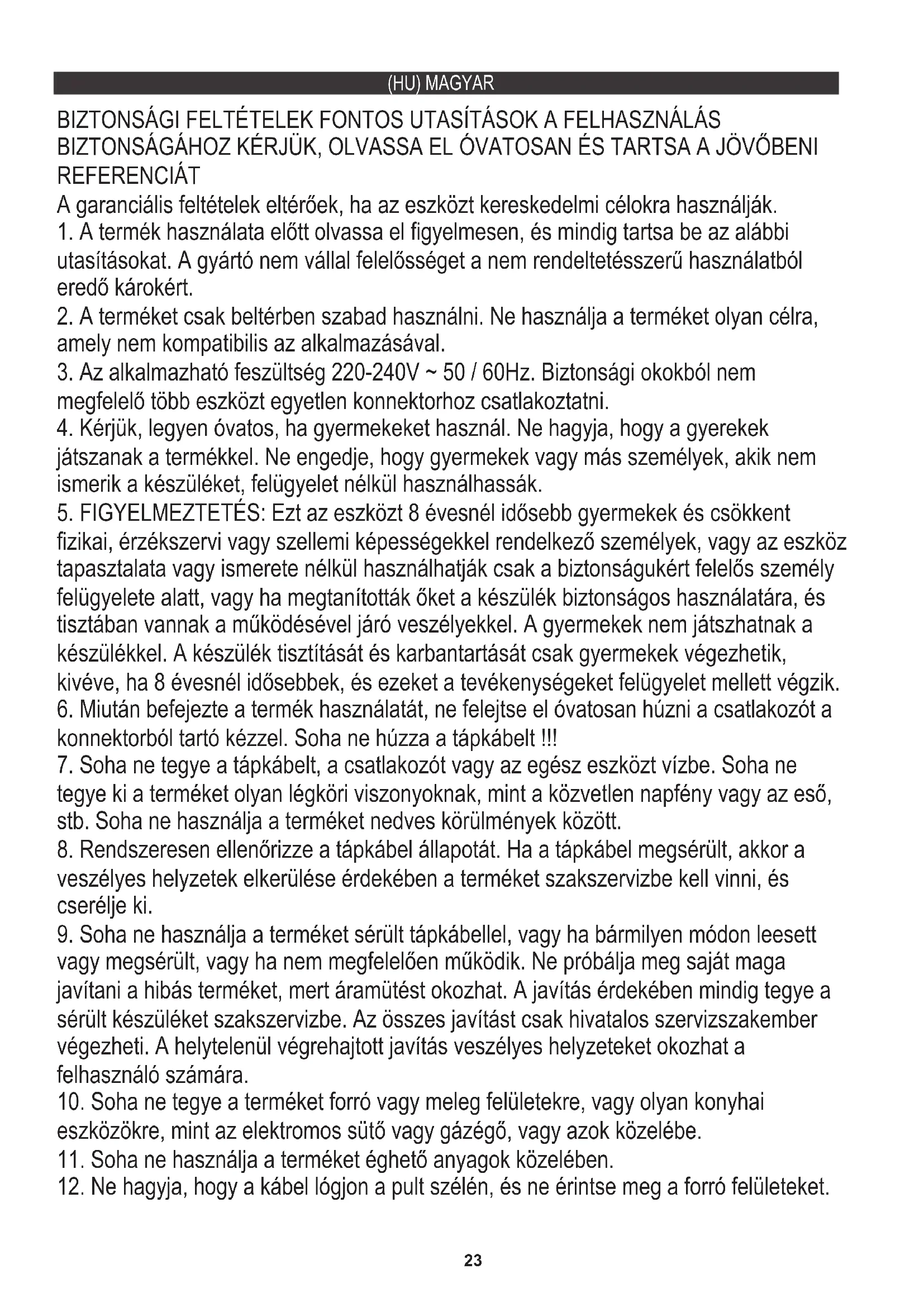 fizikai, érzékszervi vagy szellemi képességekkel rendelkező személyek, vagy az eszköz tapasztalata vagy ismerete nélkül használhatják csak a biztonságukért felelős személy felügyelete alatt, vagy ha megtanították őket a készülék biztonságos használatára, és tisztában vannak a működésével járó veszélyekkel. A gyermekek nem játszhatnak a készülékkel. A készülék tisztítását és karbantartását csak gyermekek végezhetik, kivéve, ha 8 évesnél idősebbek, és ezeket a tevékenységeket felügyelet mellett végzik.