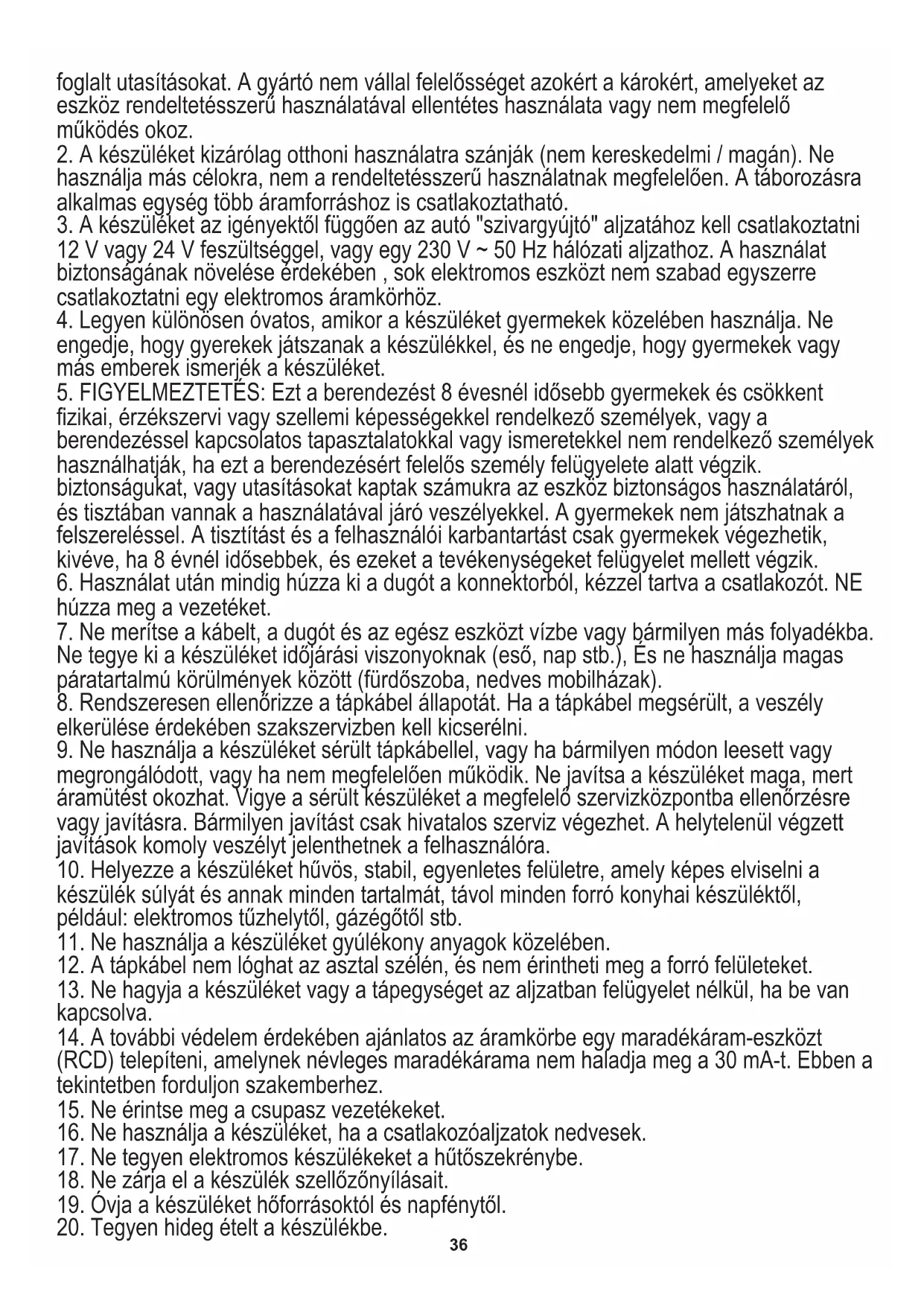 4. Ez a hordozható hűtőszekrény alkalmas autó használatra és kempingezésre, azonban a készüléket ne tegye ki esőnek vagy egyéb súlyos időjárási tényezőknek. 5. Ezt a hordozható hűtőszekrényt nem szabad beépített vagy süllyesztett helyre tenni. A készüléket szabadon álló kialakításra tervezték.