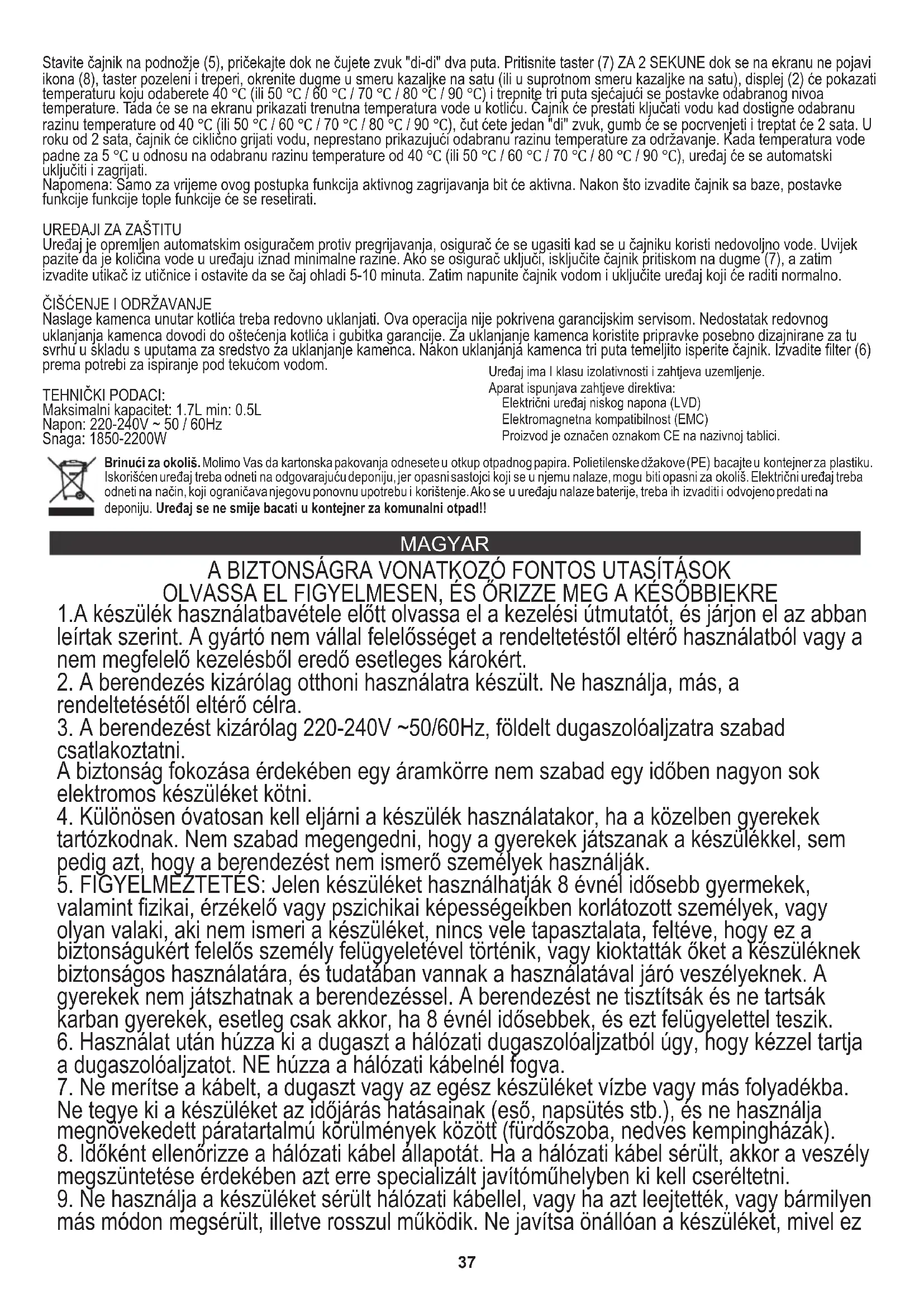 5. FIGYELMEZTETÉS: Jelen készüléket használhatják 8 évnél idősebb gyermekek,