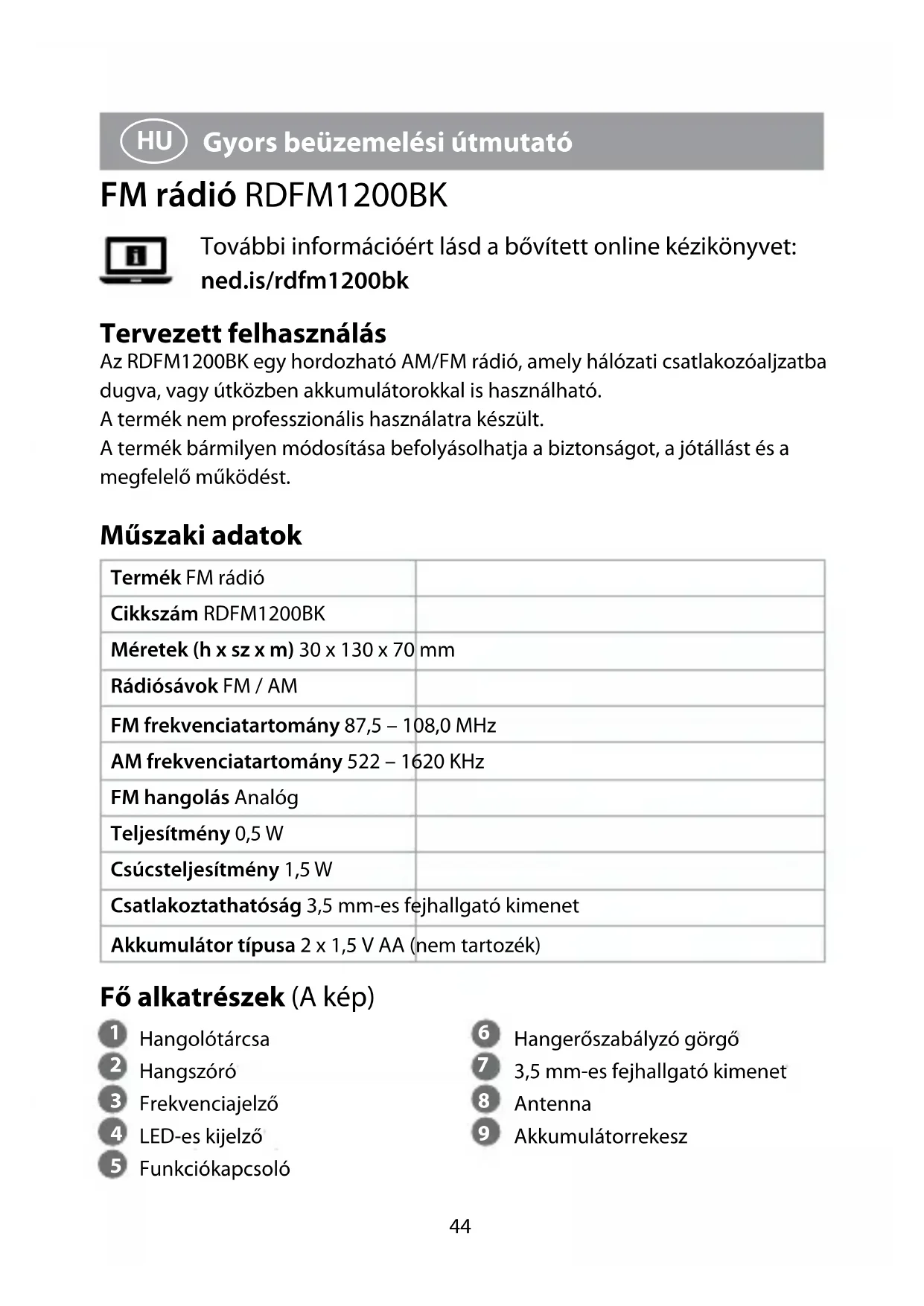 Gyors beüzemelési útmutató FM rádió RDFM1200BK További információért lásd a bővített online kézikönyvet: ned.is/rdfm1200bk Tervezett felhasználás Az RDFM1200BK egy hordozható AM/FM rádió, amely hálózati csatlakozóaljzatba dugva, vagy útközben akkumulátorokkal is használható. A termék nem professzionális használatra készült. A termék bármilyen módosítása befolyásolhatja a biztonságot, a jótállást és a megfelelő működést. Műszaki adatok Termék FM rádió Cikkszám RDFM1200BK Méretek (h x sz x m) 30 x 130 x 70 mm Rádiósávok FM / AM FM frekvenciatartomány 87,5 – 108,0 MHz AM frekvenciatartomány 522 – 1620 KHz FM hangolás Analóg Teljesítmény 0,5 W Csúcsteljesítmény 1,5 W Csatlakoztathatóság 3,5 mm-es fejhallgató kimenet Akkumulátor típusa 2 x 1,5 V AA (nem tartozék) Fő alkatrészek (A kép)