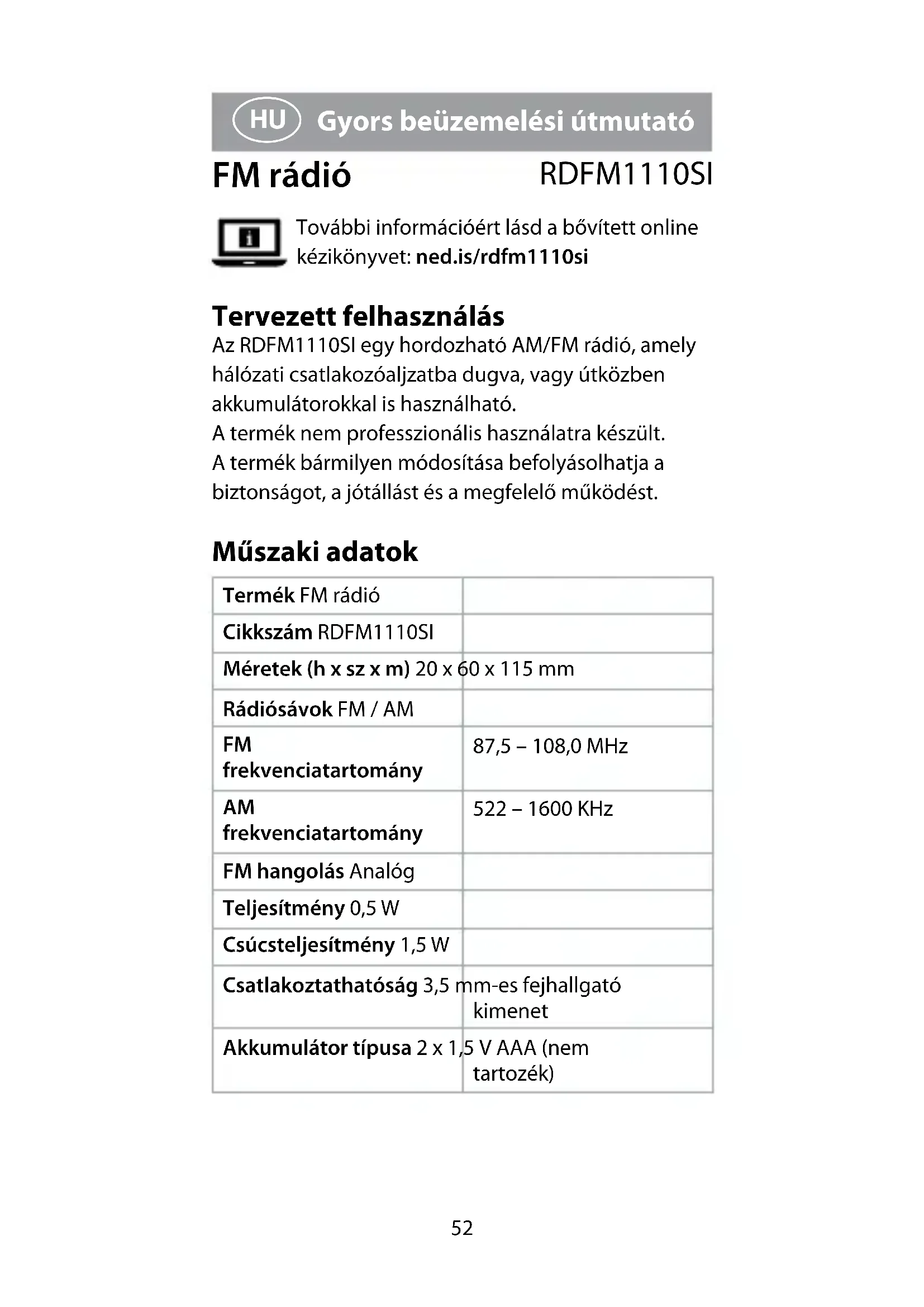 Gyors beüzemelési útmutató FM rádió RDFM1110SI További információért lásd a bővített online kézikönyvet: ned.is/rdfm1110si Tervezett felhasználás Az RDFM1110SI egy hordozható AM/FM rádió, amely hálózati csatlakozóaljzatba dugva, vagy útközben akkumulátorokkal is használható. A termék nem professzionális használatra készült. A termék bármilyen módosítása befolyásolhatja a biztonságot, a jótállást és a megfelelő működést. Műszaki adatok Termék FM rádió Cikkszám RDFM1110SI Méretek (h x sz x m) 20 x 60 x 115 mm Rádiósávok FM / AM