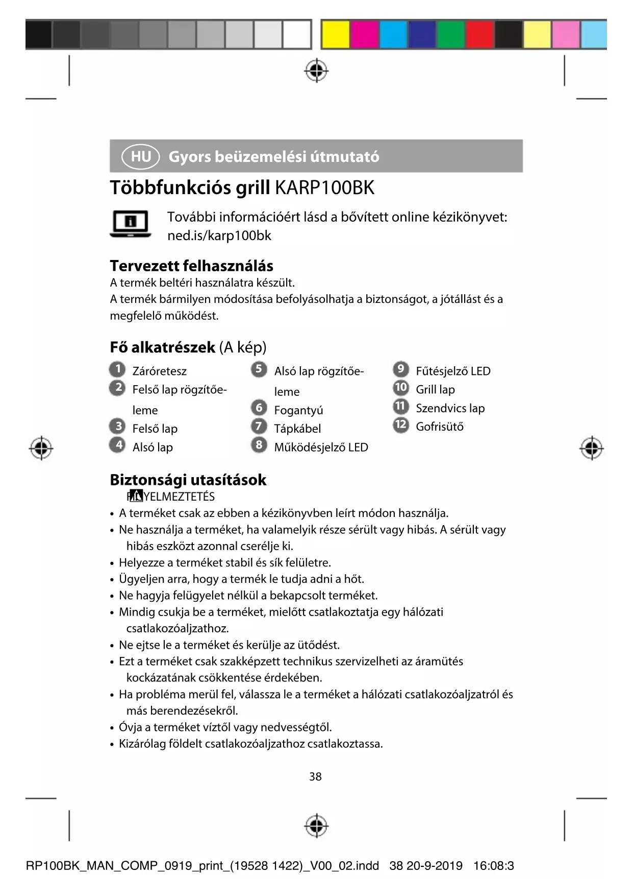 Gyors beüzemelési útmutató Többfunkciós grill KARP100BK További információért lásd a bővített online kézikönyvet: ned.is/karp100bk Tervezett felhasználás A termék beltéri használatra készült.A termék bármilyen módosítása befolyásolhatja a biztonságot, a jótállást és a megfelelő működést. Fő alkatrészek (A kép)