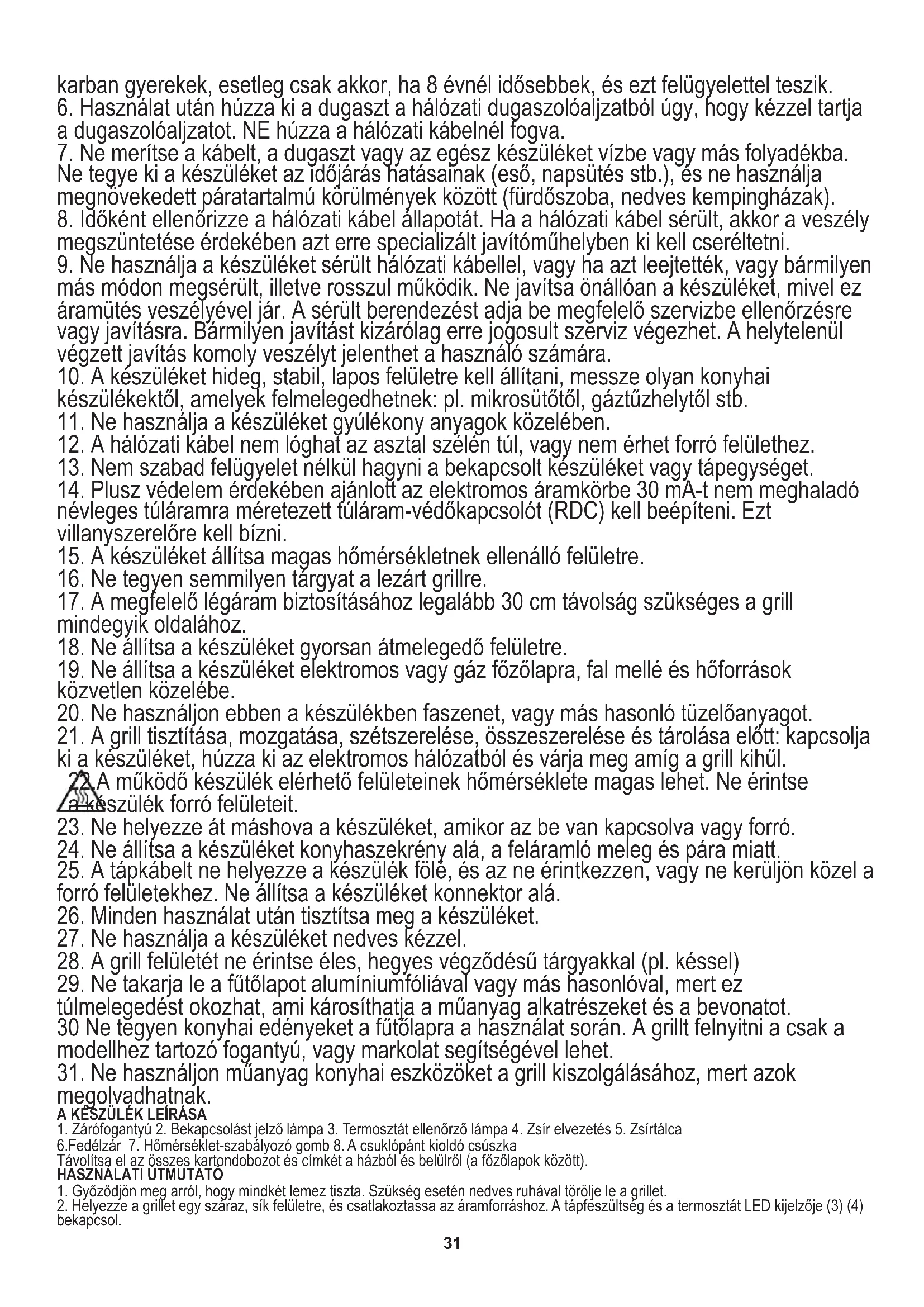 22.A működő készülék elérhető felületeinek hőmérséklete magas lehet. Ne érintse a készülék forró felületeit. A KÉSZÜLÉK LEÍRÁSA 30 Ne tegyen konyhai edényeket a fűtőlapra a használat során. A grillt felnyitni a csak a modellhez tartozó fogantyú, vagy markolat segítségével lehet.
