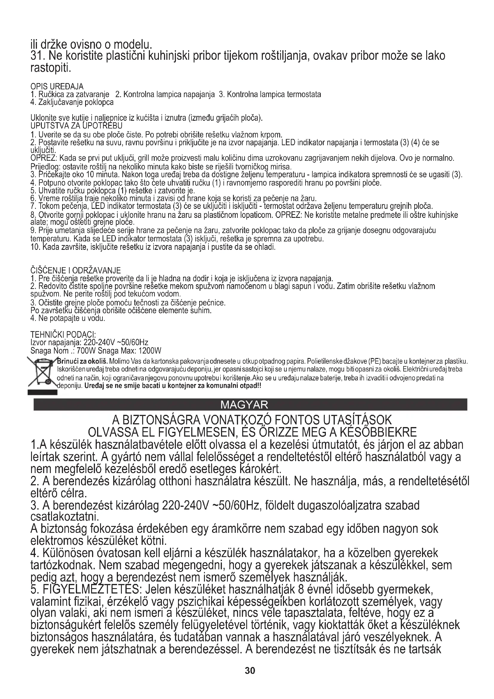 VIGYÁZAT! Amikor először bekapcsolja, a grill kis mennyiségű füstöt okozhat egyes részek felmelegedésekor. Ez normális. Javaslat: hagyja a grillet néhány percig hagyni, hogy megszabaduljon a gyári szagtól. Törődünk a természeti környezetért. Papír csomagokat kérünk adjanak át a papírhulladékra. Polietilén zacskókat (PE) dobjanak ki a műanyag tartályba. Kimerült gépe vissza kell adni a megfelelő taroló pontjához, mert a gépben levők veszélyes részek, veszedelmesek lehet a környezetnek. Az elektromos gép így kell visszaadni, hogy korlátozzon a re-használatát. Ha az elemek vannak a gépben, ki kell húzni ezeket és a visszakelladni külön tároló pontjához. SUOMI