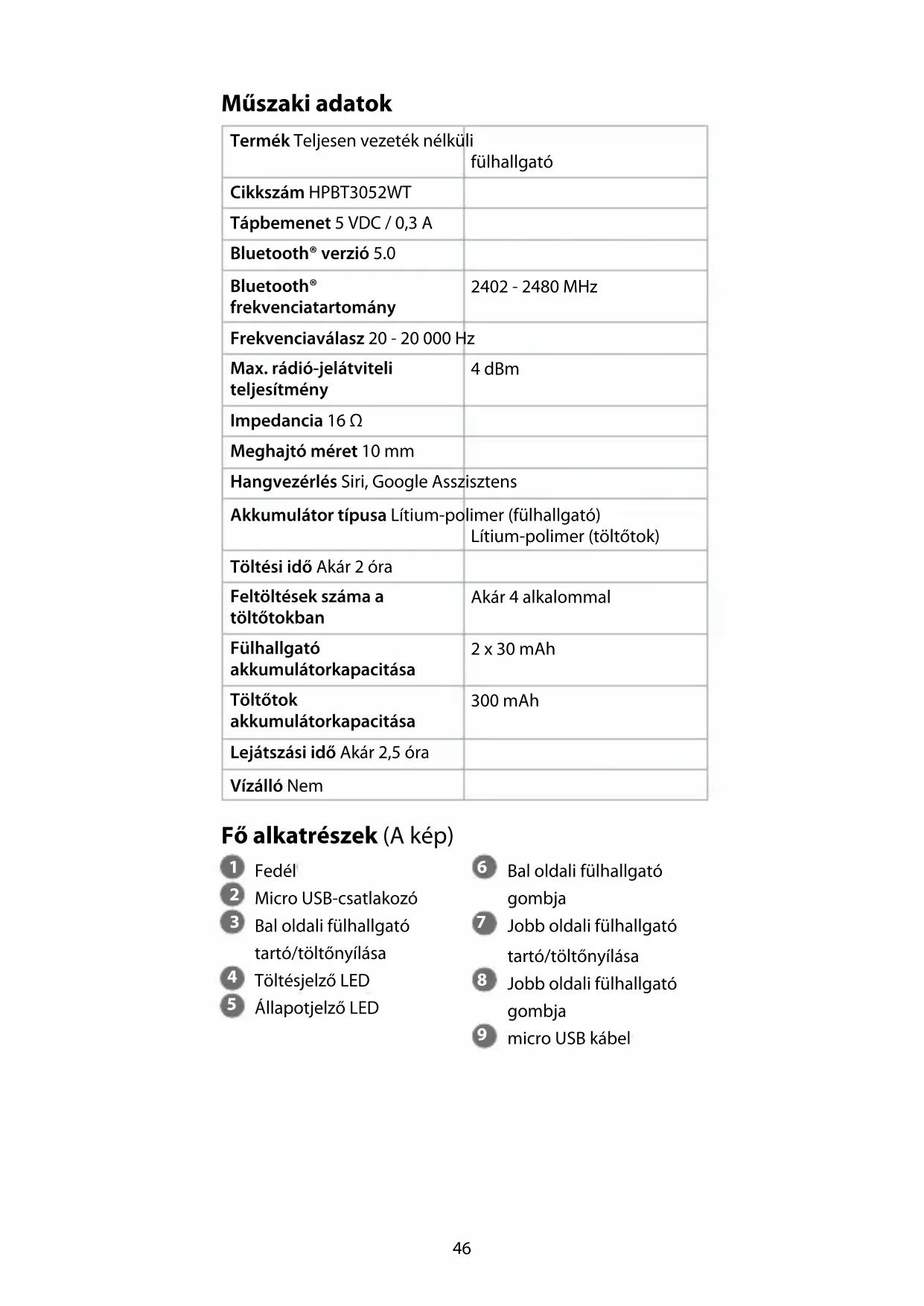 Gyors beüzemelési útmutató Teljesen vezeték nélküli fülhallgató HPBT3052WT További információért lásd a bővített online kézikönyvet: ned.is/hpbt3052wt Tervezett felhasználás A Nedis HPBT3052WT egy teljesen vezeték nélküli fülhallgató. A termék bármely Bluetooth-elérésű audio/videolejátszó készülékkel párosítható. A fülhallgatót a teljesen feltöltött töltőtokban akár 4 alkalommal fel lehet tölteni. A termék bármilyen módosítása befolyásolhatja a biztonságot, a jótállást és a megfelelő működést.46 Műszaki adatok Termék Teljesen vezeték nélküli fülhallgató Cikkszám HPBT3052WT Tápbemenet 5 VDC / 0,3 A Bluetooth® verzió 5.0 Bluetooth® frekvenciatartomány 2402 - 2480 MHz Frekvenciaválasz 20 - 20000 Hz Max. rádió-jelátviteli teljesítmény 4 dBm Impedancia 16 Ω Meghajtó méret 10 mm Hangvezérlés Siri, Google Asszisztens Akkumulátor típusa Lítium-polimer (fülhallgató) Lítium-polimer (töltőtok) Töltési idő Akár 2 óra Feltöltések száma a töltőtokban Akár 4 alkalommal Fülhallgató akkumulátorkapacitása 2 x 30 mAh Töltőtok akkumulátorkapacitása 300 mAh Lejátszási idő Akár 2,5 óra Vízálló Nem Fő alkatrészek (A kép)