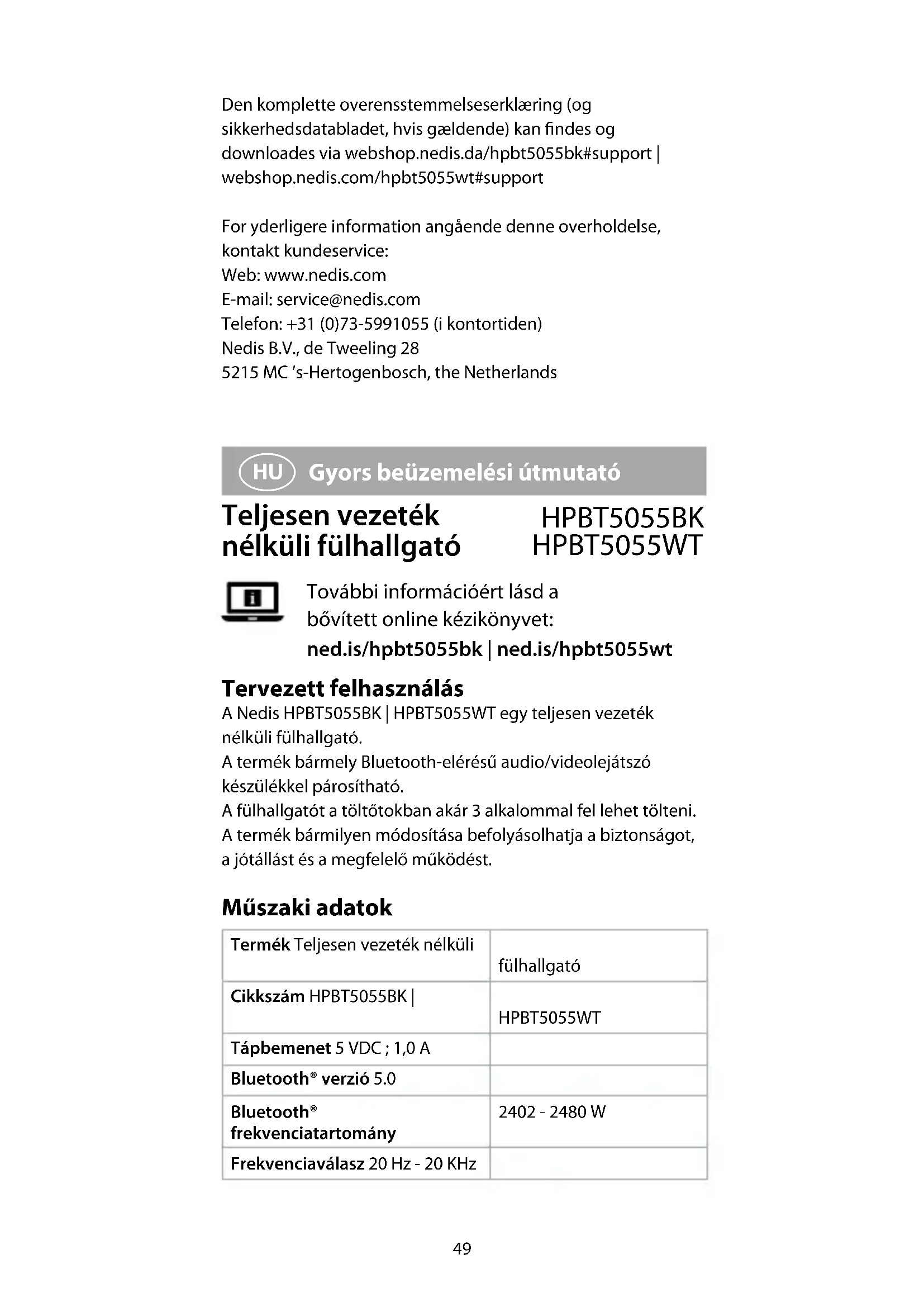és az A részt 10 másodpercig. Ezt a funkciót abban az esetben javasolt használni, ha a fülhallgatók általános használati körülmények mellett nem képesek egymáshoz csatlakozni. Megfelelőségi nyilatkozat A gyártó Nedis B.V. nevében kijelentjük, hogy a Nedis márkájú, Kínában gyártott HPBT5055BK | HPBT5055WT terméket az összes vonatkozó CE szabvány és előírás szerint bevizsgáltuk, és a termék minden vizsgálaton sikeresen megfelelt. Ez magában foglalja – nem kizárólagos jelleggel – a rádióberendezésekről szóló 2014/53/EU irányelvet.A teljes megfelelőségi nyilatkozat (és ha van, akkor a biztonsági adatlap) a webshop.nedis.hu/hpbt5055bk#support | webshop.nedis.com/hpbt5055wt#support címen elérhető és letölthetőA megfelelőséggel kapcsolatos további információkért hívja az ügyfélszolgálatot:Web: www.nedis.comE-mail: service@nedis.comTelefon: +31 (0)73-5991055 (munkaidőben)Nedis B.V., de Tweeling 285215 MC ’s-Hertogenbosch, Hollandia