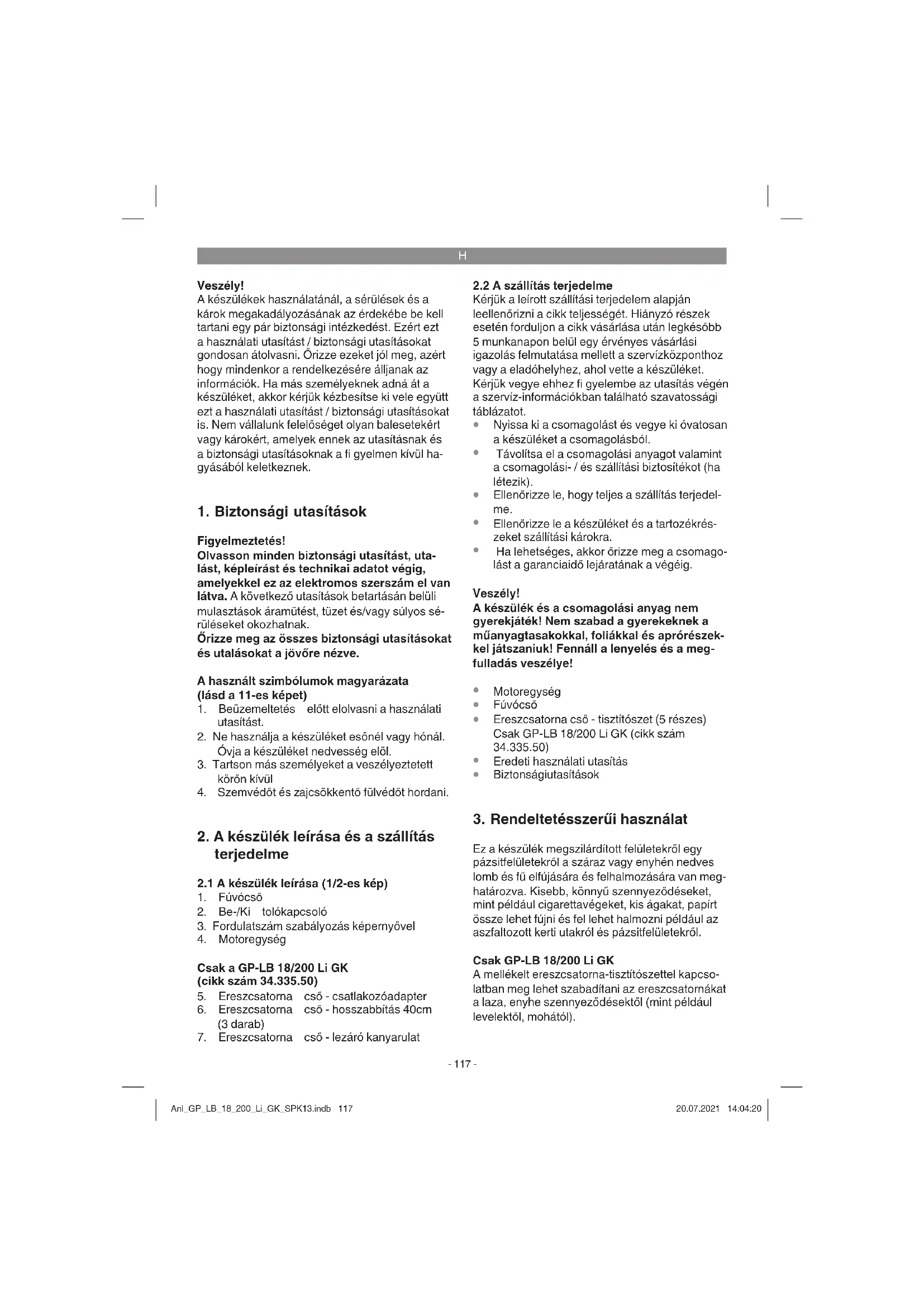 Ez a készülék megszilárdított felületekről egy pázsitfelületekről a száraz vagy enyhén nedves lomb és fű elfújására és felhalmozására van meg- határozva. Kisebb, könnyű szennyeződéseket, mint például cigarettavégeket, kis ágakat, papírt össze lehet fújni és fel lehet halmozni például az aszfaltozott kerti utakról és pázsitfelületekről. Csak GP-LB 18/200 Li GK A mellékelt ereszcsatorna-tisztítószettel kapcso- latban meg lehet szabadítani az ereszcsatornákat a laza, enyhe szennyeződésektől (mint például levelektől, mohától). Anl_GP_LB_18_200_Li_GK_SPK13.indb 117Anl_GP_LB_18_200_Li_GK_SPK13.indb 117 20.07.2021 14:04:2020.07.2021 14:04:20H
