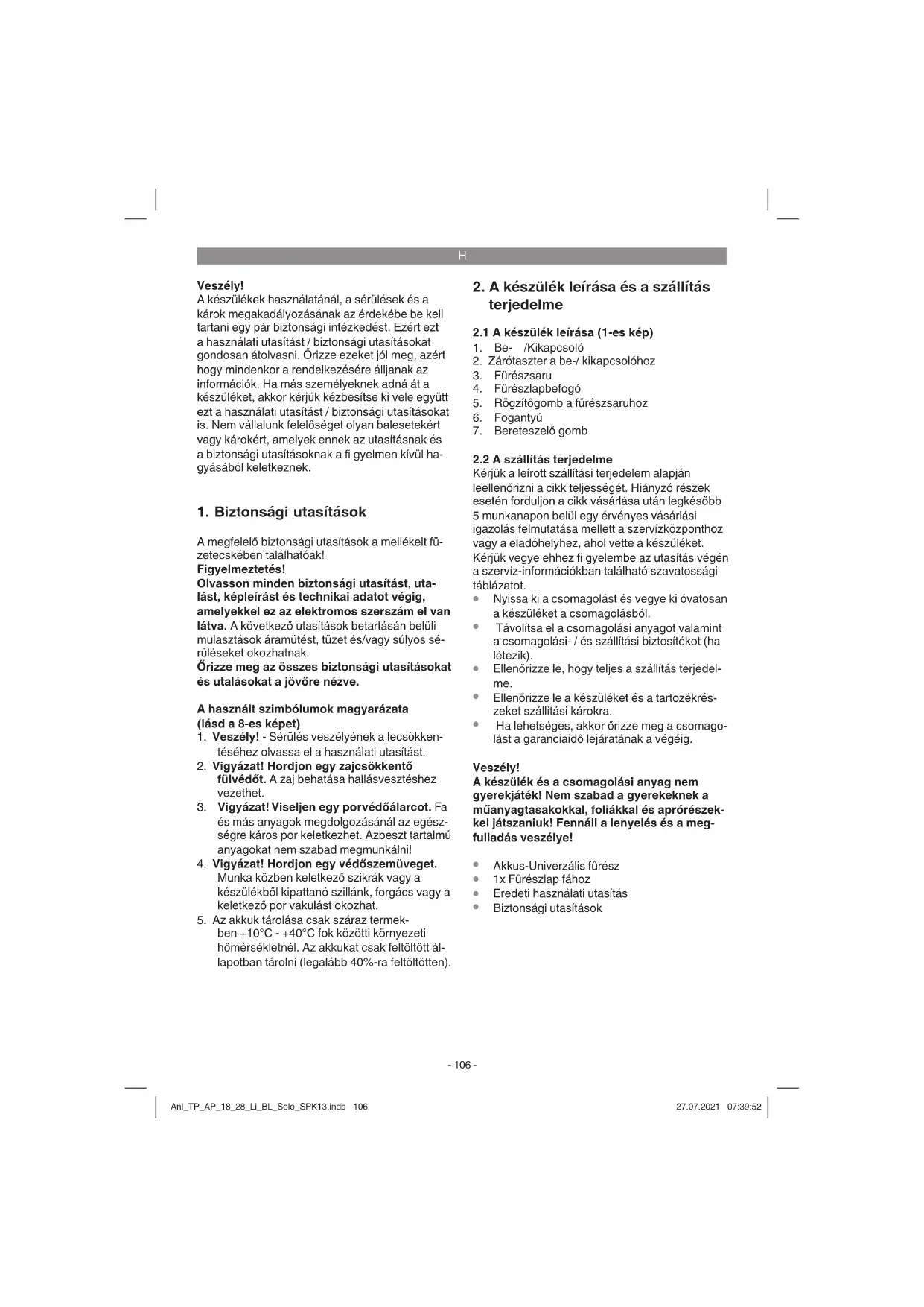 A készüléket és a készülék tartozékait egy sötét, száraz és fagymentes valamint gyerekek számára nem hozzáférhető helyen tárolni. Az optimális tárolási hőmérséklet 5 és 30 °C között van. Az elektromos szerszámot az eredeti csomagolás- ban őrizni. Anl_TP_AP_18_28_Li_BL_Solo_SPK13.indb 109Anl_TP_AP_18_28_Li_BL_Solo_SPK13.indb 109 27.07.2021 07:39:5327.07.2021 07:39:53H
