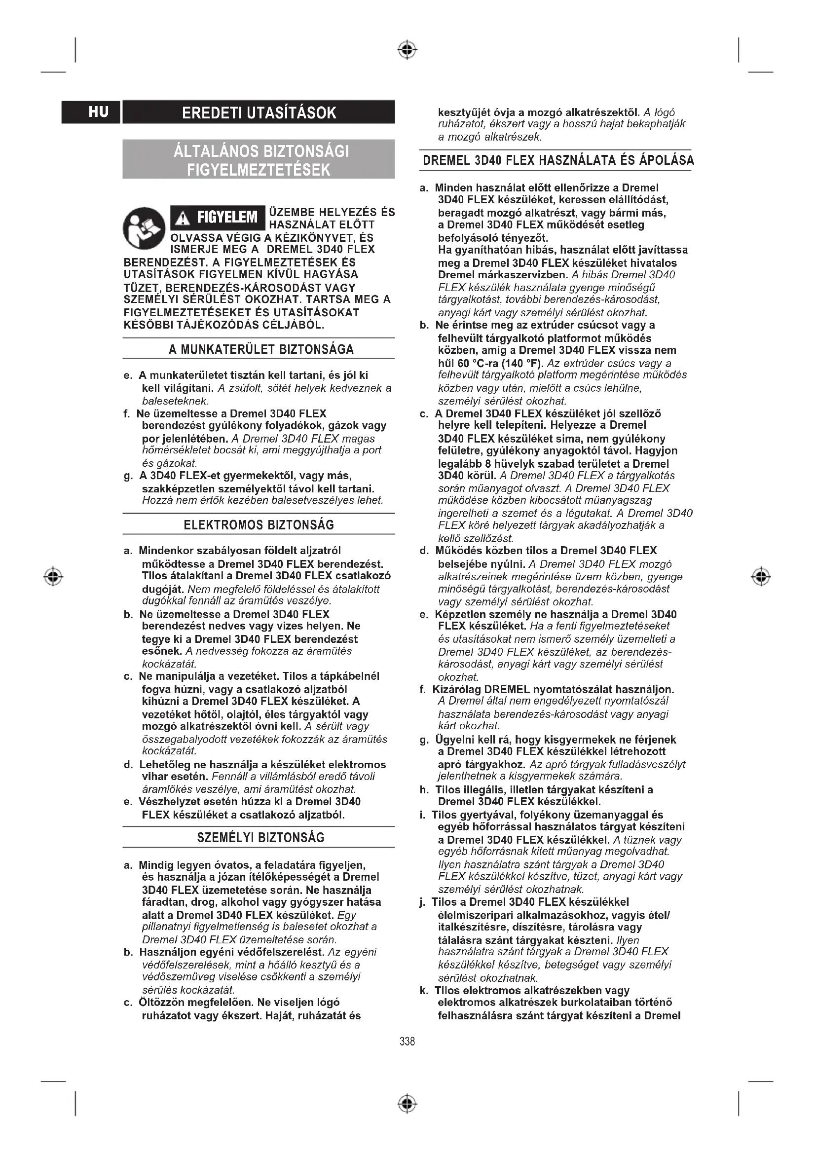 tartóból. Az edzett üveglap széle személyi sérülést okozhat. y. Ne csavarja vagy hajlítsa el a tárgyalkotó platformot a tárgyak kivételekor. Az edzett üveglap leválhat a műanyag tartóról, és személyi sérülést okozhat. z. A Dremel nem vállal felelősséget a Dremel 3D40 FLEX berendezéssel készített tárgyak szerkezeti épségéért vagy használhatóságáért. A tapasztalatlan tervezők által alkotott szerkezeti modellek anyagi kárt vagy személyi sérülést okozhatnak. 338kesztyűjét óvja a mozgó alkatrészektől. A lógó ruházatot, ékszert vagy a hosszú hajat bekaphatják a mozgó alkatrészek. DREMEL 3D40 FLEX HASZNÁLATA ÉS ÁPOLÁSA a. Minden használat előtt ellenőrizze a Dremel 3D40 FLEX készüléket, keressen elállítódást, beragadt mozgó alkatrészt, vagy bármi más, a Dremel 3D40 FLEX működését esetleg befolyásoló tényezőt. Ha gyaníthatóan hibás, használat előtt javíttassa meg a Dremel 3D40 FLEX készüléket hivatalos Dremel márkaszervizben. A hibás Dremel 3D40 FLEX készülék használata gyenge minőségű tárgyalkotást, további berendezés-károsodást, anyagi kárt vagy személyi sérülést okozhat. b. Ne érintse meg az extrúder csúcsot vagy a felhevült tárgyalkotó platformot működés közben, amíg a Dremel 3D40 FLEX vissza nem hűl 60 °C-ra (140 °F). Az extrúder csúcs vagy a felhevült tárgyalkotó platform megérintése működés közben vagy után, mielőtt a csúcs lehűlne, személyi sérülést okozhat. c. A Dremel 3D40 FLEX készüléket jól szellőző helyre kell telepíteni. Helyezze a Dremel 3D40 FLEX készüléket sima, nem gyúlékony felületre, gyúlékony anyagoktól távol. Hagyjon legalább 8 hüvelyk szabad területet a Dremel 3D40 körül. A Dremel 3D40 FLEX a tárgyalkotás során műanyagot olvaszt. A Dremel 3D40 FLEX működése közben kibocsátott műanyagszag ingerelheti a szemet és a légutakat. A Dremel 3D40 FLEX köré helyezett tárgyak akadályozhatják a kellő szellőzést. d. Működés közben tilos a Dremel 3D40 FLEX belsejébe nyúlni. A Dremel 3D40 FLEX mozgó alkatrészeinek megérintése üzem közben, gyenge minőségű tárgyalkotást, berendezés-károsodást vagy személyi sérülést okozhat. e. Képzetlen személy ne használja a Dremel 3D40 FLEX készüléket. Ha a fenti gyelmeztetéseket és utasításokat nem ismerő személy üzemelteti a Dremel 3D40 FLEX készüléket, az berendezés- károsodást, anyagi kárt vagy személyi sérülést okozhat. f. Kizárólag DREMEL nyomtatószálat használjon. A Dremel által nem engedélyezett nyomtatószál használata berendezés-károsodást vagy anyagi kárt okozhat. g. Ügyelni kell rá, hogy kisgyermekek ne férjenek a Dremel 3D40 FLEX készülékkel létrehozott apró tárgyakhoz. Az apró tárgyak fulladásveszélyt jelenthetnek a kisgyermekek számára. h. Tilos illegális, illetlen tárgyakat készíteni a Dremel 3D40 FLEX készülékkel.