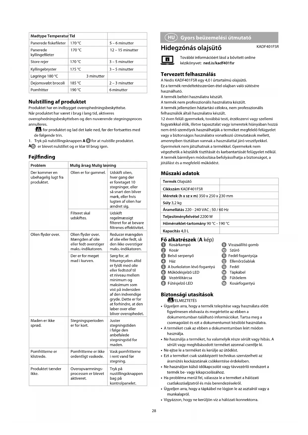 Gyors beüzemelési útmutató Hidegzónás olajsütő KADF401FSRTovábbi információért lásd a bővített online kézikönyvet: ned.is/kadf401fsr Tervezett felhasználás A Nedis KADF401FSR egy 4,0 l űrtartalmú olajsütő.Ez a termék rendeltetésszerűen étel olajban való sütésére használható.A termék beltéri használatra készült.A termék nem professzionális használatra készült.A termék jellemzően háztartási célokra, nem professzionális felhasználók általi használatra készült.12 éven felüli gyermekek, továbbá testi, érzékszervi vagy szellemi fogyatékkal élők, illetve tapasztalat vagy ismeretek hiányában hozzá nem értő személyek használhatják a terméket megfelelő felügyelet vagy a biztonságos használatra vonatkozó útmutatások mellett, amennyiben tisztában vannak a használattal járó veszélyekkel. Gyermekek nem játszhatnak a termékkel. Gyermekek nem végezhetik a készülék tisztítását és karbantartását felügyelet nélkül.A termék bármilyen módosítása befolyásolhatja a biztonságot, a jótállást és a megfelelő működést. Műszaki adatok Termék OlajsütőCikkszám KADF401FSRMéretek (h x sz x m) 350 x 250 x 230 mmSúly 3,2 kgÁramellátás 220 - 240 VAC ; 50 / 60 HzTeljesítményfelvétel 2200 WHőmérséklet-tartomány 90 °C - 190 °CKapacitás 4,0 L Fő alkatrészek (A kép) 1 Kosárkampó 2 Kosár 3 Belső serpenyő 4 Ház 5 A burkolaton lévő fogantyú 6 Működésjelző LED 7 Vezérlőtárcsa 8 Fűtésjelző LED 9 Visszaállító gomb q Szűrő w Fedél fogantyúja e Ellenőrzőablak r Fedél t Tápkábel y Fűtőelem u Kosárfogantyú Biztonsági utasítások