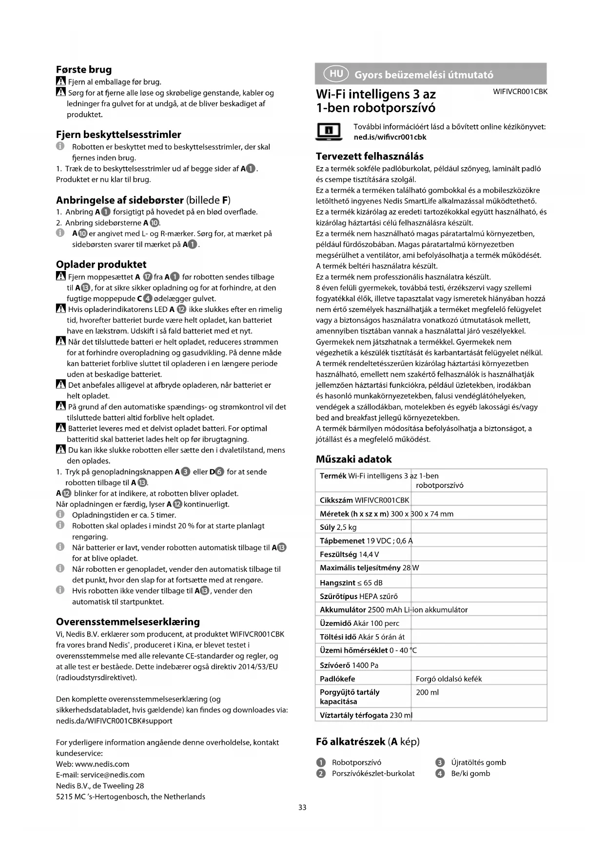 helyzetbe, feltölteni magát. Amikor a robot feltöltődik, akkor automatikusan visszatér arra a pontra, ahol abbahagyta, és onnan folytatja a tisztítást. Ha a robot nem tér vissza az A helyzetbe, akkor automatikusan visszatér a kiindulási pontra. Megfelelőségi nyilatkozat A gyártó Nedis B.V. nevében kijelentjük, hogy a Nedis márkájú, Kínában gyártott WIFIVCR001CBK terméket az összes vonatkozó CE szabvány és előírás szerint bevizsgáltuk, és a termék minden vizsgálaton sikeresen megfelelt. Ez magában foglalja – nem kizárólagos jelleggel – a rádióberendezésekről szóló 2014/53/EU irányelvet.A teljes megfelelőségi nyilatkozat (és ha van, akkor a biztonsági adatlap) a:nedis.hu/WIFIVCR001CBK#supportA megfelelőséggel kapcsolatos további információkért hívja az ügyfélszolgálatot:Web: www.nedis.comE-mail: service@nedis.comNedis B.V., de Tweeling 285215 MC ’s-Hertogenbosch, Hollandia