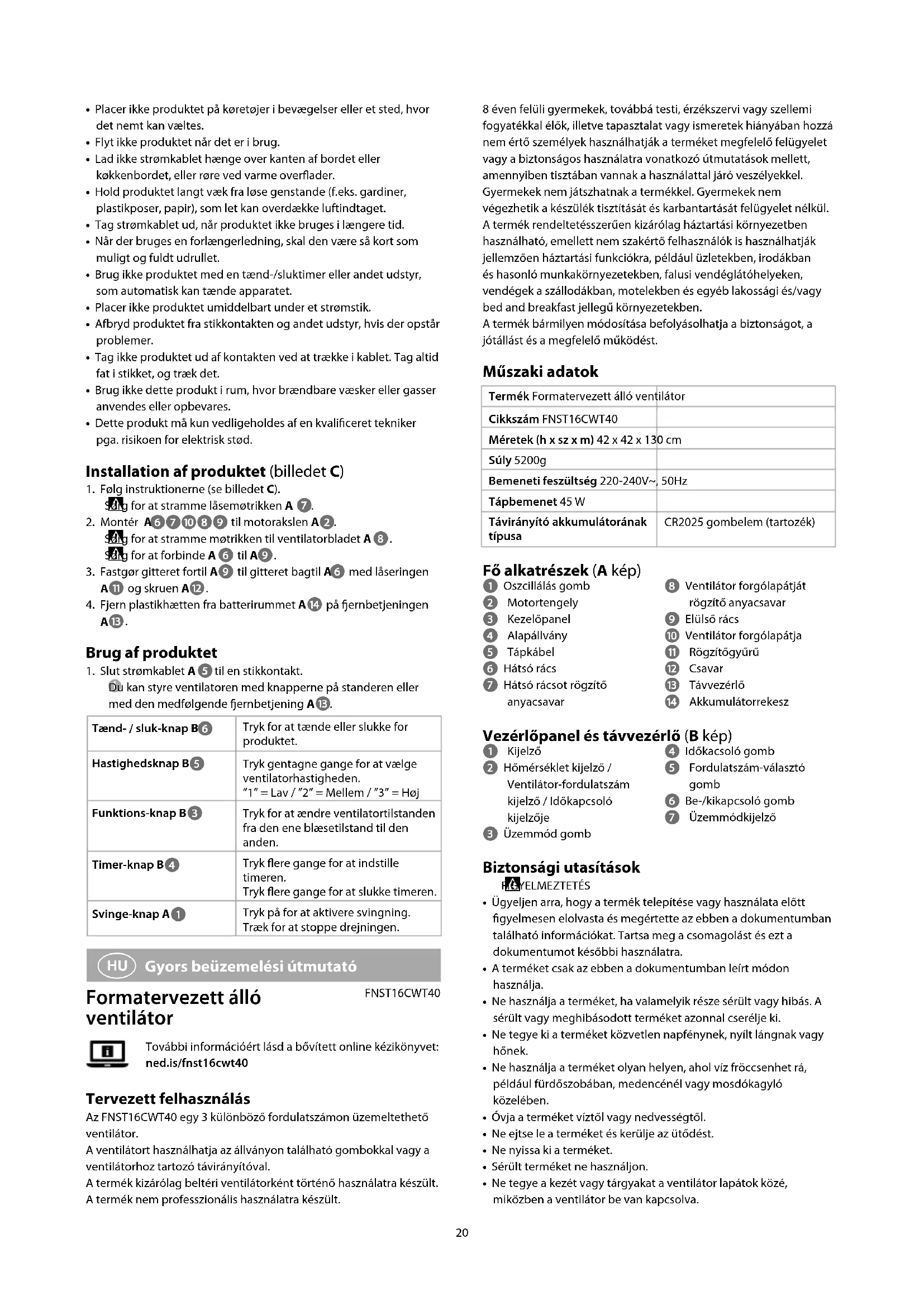 Vejledning til hurtig start Stående designventilator FNST16CWT40Yderligere oplysninger ndes i den udvidede manual online: ned.is/fnst16cwt40 Tilsigtet brug FNST16CWT40 er en ventilator med 3 forskellige hastigheder.Du kan styre ventilatoren med knapperne på standeren eller med den medfølgende ernbetjening.Dette produkt er udelukkende tilsigtet som en ventilator til indendørs brug.Dette produkt er ikke beregnet til professionel brug.Dette produkt kan anvendes af børn fra 8 år og op og af personer med reducerede fysiske, sensoriske eller mentale evner eller mangel på erfaring og viden, hvis de har fået oplæring eller instruktion angående brug af produktet på en sikker måde og forstår, at farer er involverede. Børn må ikke lege med produktet. Rengøring og brugervedligeholdelse må ikke udføres af børn uden opsyn.Dette produkt er beregnet til brug i husholdningsmiljøer til typiske funktioner i hjemmet, der også kan udføres af ikke-eksperter til typiske husholdningsformål, såsom: butikker, kontorer eller andre lignende arbejdsmiljøer, landbrugsbygninger, anvendelse af kunder på hoteller, moteller og andre beboelsesmiljøer og/eller i indkvarteringer såsom ’bed and breakfast’.Enhver modicering af produktet kan have konsekvenser for sikkerhed, garanti og korrekt funktion. Specikationer Produkt Stående designventilatorVarenummer FNST16CWT40Mål (l x b x h) 42 x 42 x 130 cmVægt 5200gIndgangsspænding 220-240V~, 50HzStrøminput 45 WBatteritype til ernbetjening CR2025 knapbatteri (medfølger) Hoveddele (billede A) 1 Svinge-knap 2 Motoraksel 3 Kontrolpanel 4 Stander 5 Strømkabel 6 Gitter bagtil 7 Monteringsmøtrik til gitter bagtil 8 Møtrik til ventilatorblad 9 Gitter fortil q Ventilatorblad w Låsering e Skrue r Fjernbetjening t Batterirum Kontrolpanel og ernbetjening (Billede B) 1 Skærm 2 Temperaturindikator / Indikator for viftehastighed / Timerindikator 3 Funktions-knap 4 Timer-knap 5 Hastighedsknap 6 Knappen Power 7 Funktionsindikator20 8 éven felüli gyermekek, továbbá testi, érzékszervi vagy szellemi fogyatékkal élők, illetve tapasztalat vagy ismeretek hiányában hozzá nem értő személyek használhatják a terméket megfelelő felügyelet vagy a biztonságos használatra vonatkozó útmutatások mellett, amennyiben tisztában vannak a használattal járó veszélyekkel. Gyermekek nem játszhatnak a termékkel. Gyermekek nem végezhetik a készülék tisztítását és karbantartását felügyelet nélkül.A termék rendeltetésszerűen kizárólag háztartási környezetben használható, emellett nem szakértő felhasználók is használhatják jellemzően háztartási funkciókra, például üzletekben, irodákban és hasonló munkakörnyezetekben, falusi vendéglátóhelyeken, vendégek a szállodákban, motelekben és egyéb lakossági és/vagy bed and breakfast jellegű környezetekben.A termék bármilyen módosítása befolyásolhatja a biztonságot, a jótállást és a megfelelő működést. Műszaki adatok Termék Formatervezett álló ventilátorCikkszám FNST16CWT40Méretek (h x sz x m) 42 x 42 x 130 cmSúly 5200gBemeneti feszültség 220-240V~, 50HzTápbemenet 45 WTávirányító akkumulátorának típusaCR2025 gombelem (tartozék) Fő alkatrészek (A kép) 1 Oszcillálás gomb2 Motortengely3 Kezelőpanel4 Alapállvány5 Tápkábel6 Hátsó rács7 Hátsó rácsot rögzítő anyacsavar8 Ventilátor forgólapátját rögzítő anyacsavar9 Elülső rácsq Ventilátor forgólapátjaw Rögzítőgyűrűe Csavarr Távvezérlőt Akkumulátorrekesz Vezérlőpanel és távvezérlő (B kép) 1 Kijelző2 Hőmérséklet kijelző / Ventilátor-fordulatszám kijelző / Időkapcsoló kijelzője3 Üzemmód gomb4 Időkacsoló gomb5 Fordulatszám-választó gomb 6 Be-/kikapcsoló gomb7 Üzemmódkijelző Biztonsági utasítások