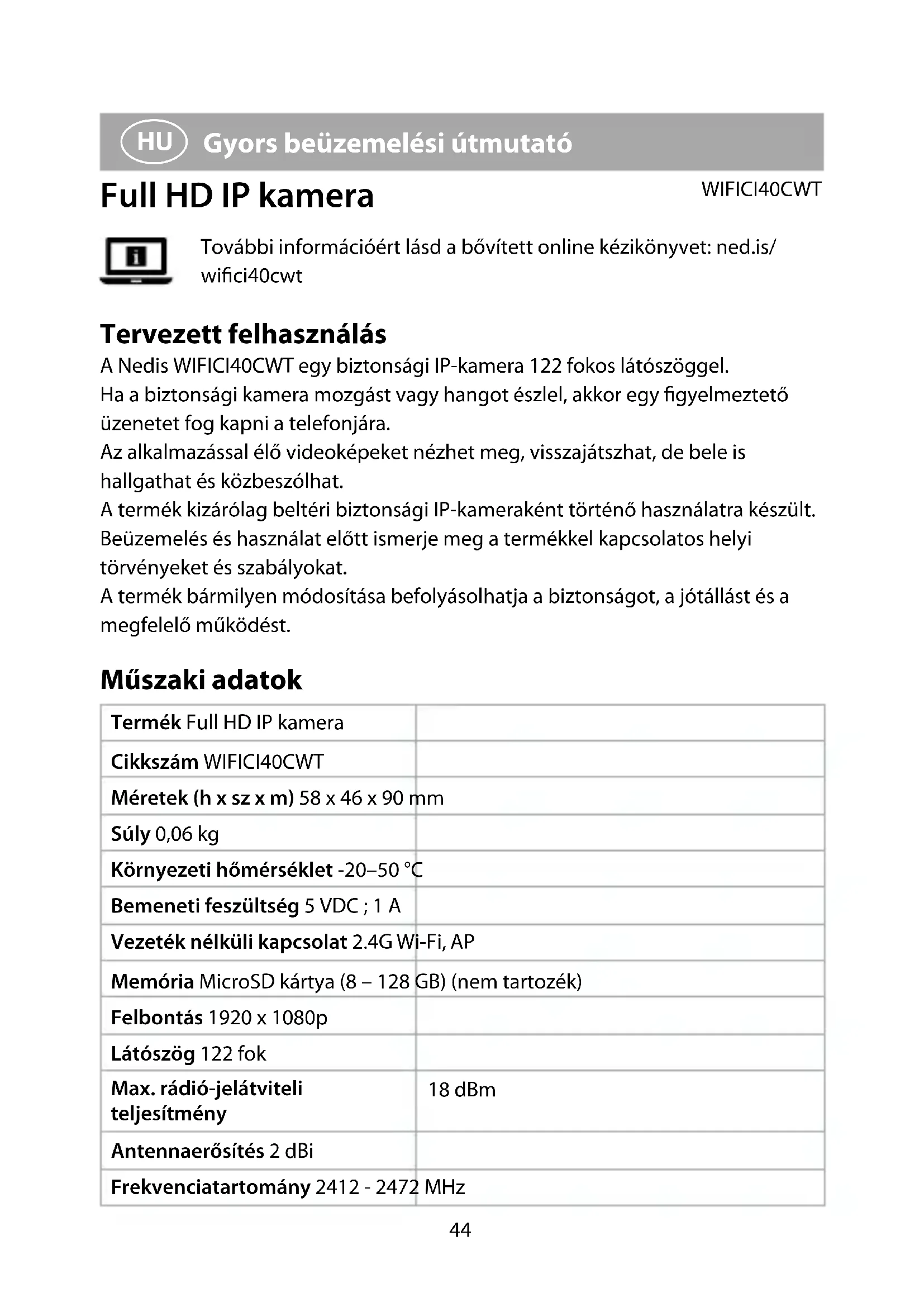 Gyors beüzemelési útmutató Full HD IP kamera WIFICI40CWT További információért lásd a bővített online kézikönyvet: ned.is/ wici40cwt Tervezett felhasználás A Nedis WIFICI40CWT egy biztonsági IP-kamera 122 fokos látószöggel. Ha a biztonsági kamera mozgást vagy hangot észlel, akkor egy gyelmeztető üzenetet fog kapni a telefonjára. Az alkalmazással élő videoképeket nézhet meg, visszajátszhat, de bele is hallgathat és közbeszólhat. A termék kizárólag beltéri biztonsági IP-kameraként történő használatra készült. Beüzemelés és használat előtt ismerje meg a termékkel kapcsolatos helyi törvényeket és szabályokat. A termék bármilyen módosítása befolyásolhatja a biztonságot, a jótállást és a megfelelő működést. Műszaki adatok Termék Full HD IP kamera Cikkszám WIFICI40CWT Méretek (h x sz x m) 58 x 46 x 90 mm Súly 0,06 kg Környezeti hőmérséklet -20–50 °C Bemeneti feszültség 5 VDC ; 1 A Vezeték nélküli kapcsolat 2.4G Wi-Fi, AP Memória MicroSD kártya (8 – 128 GB) (nem tartozék) Felbontás 1920 x 1080p Látószög 122 fok Max. rádió-jelátviteli teljesítmény 18 dBm Antennaerősítés 2 dBi Frekvenciatartomány 2412 - 2472 MHz45 Fő alkatrészek (A kép) 1 Állapotjelző LED 2 Kameralencse 3 Mikrofon 4 Visszaállító gomb 5 Micro SD-kártya foglalata 6 Hangszóró 7 Micro USB-csatlakozó 8 USB-tápegységadapter 9 Visszaállító tű q micro USB kábel Biztonsági utasítások