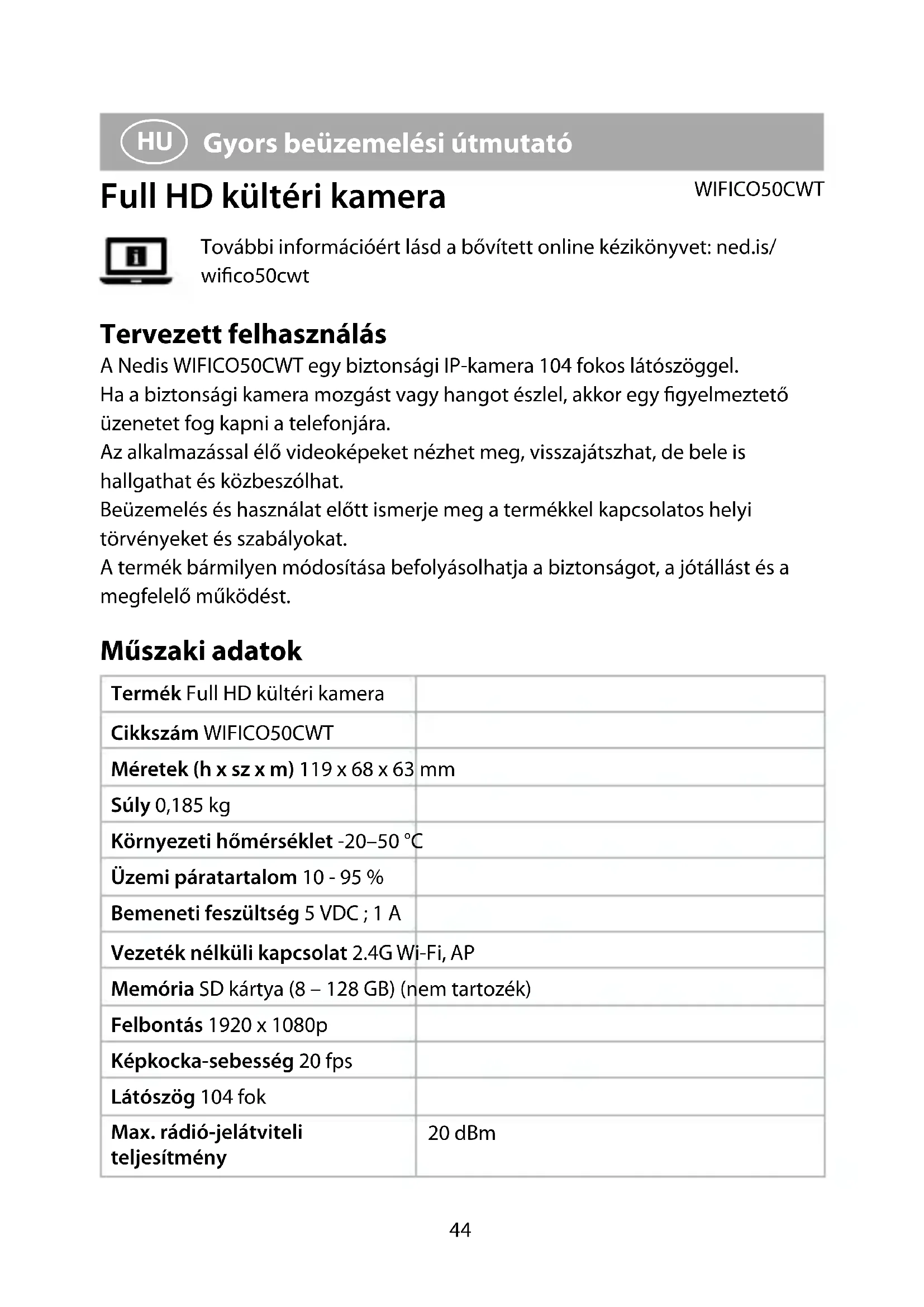 Gyors beüzemelési útmutató Full HD kültéri kamera WIFICO50CWT További információért lásd a bővített online kézikönyvet: ned.is/ wico50cwt Tervezett felhasználás A Nedis WIFICO50CWT egy biztonsági IP-kamera 104 fokos látószöggel. Ha a biztonsági kamera mozgást vagy hangot észlel, akkor egy gyelmeztető üzenetet fog kapni a telefonjára. Az alkalmazással élő videoképeket nézhet meg, visszajátszhat, de bele is hallgathat és közbeszólhat. Beüzemelés és használat előtt ismerje meg a termékkel kapcsolatos helyi törvényeket és szabályokat. A termék bármilyen módosítása befolyásolhatja a biztonságot, a jótállást és a megfelelő működést. Műszaki adatok Termék Full HD kültéri kamera Cikkszám WIFICO50CWT Méretek (h x sz x m) 119 x 68 x 63 mm Súly 0,185 kg Környezeti hőmérséklet -20–50 °C Üzemi páratartalom 10 - 95 % Bemeneti feszültség 5 VDC ; 1 A Vezeték nélküli kapcsolat 2.4G Wi-Fi, AP Memória SD kártya (8 – 128 GB) (nem tartozék) Felbontás 1920 x 1080p Képkocka-sebesség 20 fps Látószög 104 fok Max. rádió-jelátviteli teljesítmény 20 dBm45 Antennaerősítés 2 dBi Frekvenciatartomány 2412 - 2472 MHz Vízálló IP65 Fő alkatrészek (A kép) 1 Mikrofon 2 Kameralencse 3 Állapotjelző LED 4 Csavarok 5 MicroSD kártya burkolata 6 Hangszóró 7 Visszaállító gomb 8 Micro SD-kártya foglalata 9 Tápbemenet q Ethernet port w Hálózati adapter Biztonsági utasítások