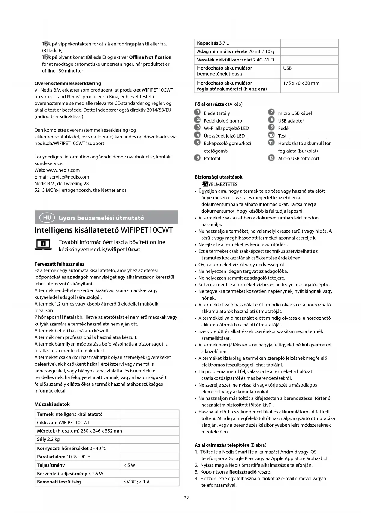 Gyors beüzemelési útmutató Intelligens kisállatetető WIFIPET10CWT További információért lásd a bővített online kézikönyvet: ned.is/wipet10cwtTervezett felhasználásEz a termék egy automata kisállatetető, amelyhez az etetési időpontokat és az adagok mennyiségét egy alkalmazáson keresztül lehet ütemezni és irányítani.A termék rendeltetésszerűen kizárólag száraz macska- vagy kutyaeledel adagolására szolgál.A termék 1,2 cm-es vagy kisebb átmérőjű eledellel működik ideálisan.7 hónaposnál atalabb, illetve az etetőtálat el nem érő macskák vagy kutyák számára a termék használata nem ajánlott.A termék beltéri használatra készült.A termék nem professzionális használatra készült.A termék bármilyen módosítása befolyásolhatja a biztonságot, a jótállást és a megfelelő működést.A terméket csak akkor használhatják olyan személyek (gyerekeket beleértve), akik csökkent zikai, érzékszervi vagy mentális képességekkel, vagy hiányos tapasztalattal és ismeretekkel rendelkeznek, ha felügyelet alatt vannak, vagy a biztonságukért felelős személy ellátta őket a termék használatához szükséges információkkal.Műszaki adatokTermék Intelligens kisállatetetőCikkszám WIFIPET10CWTMéretek (h x sz x m) 230 x 246 x 352 mmSúly 2,2 kgKörnyezeti hőmérséklet 0 - 40 °CPáratartalom 10 % - 90 %Teljesítmény < 5 WKészenléti teljesítmény < 2,5 WBemeneti feszültség 5 VDC ; < 1 A23