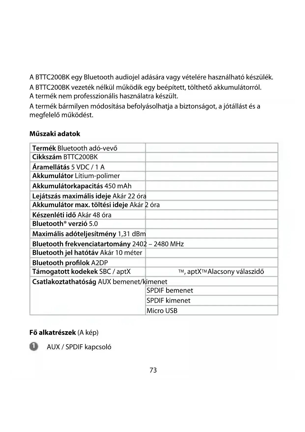Gyors beüzemelési útmutató Bluetooth adó-vevő BTTC200BK További információért lásd a bővített online kézikönyvet: ned.is/bttc200bk Tervezett felhasználás73 A BTTC200BK egy Bluetooth audiojel adására vagy vételére használható készülék. A BTTC200BK vezeték nélkül működik egy beépített, tölthető akkumulátorról. A termék nem professzionális használatra készült. A termék bármilyen módosítása befolyásolhatja a biztonságot, a jótállást és a megfelelő működést. Műszaki adatok Termék Bluetooth adó-vevő Cikkszám BTTC200BK Áramellátás 5 VDC / 1 A Akkumulátor Lítium-polimer Akkumulátorkapacitás 450 mAh Lejátszás maximális ideje Akár 22 óra Akkumulátor max. töltési ideje Akár 2 óra Készenléti idő Akár 48 óra Bluetooth® verzió 5.0 Maximális adóteljesítmény 1,31 dBm Bluetooth frekvenciatartomány 2402 – 2480 MHz Bluetooth jel hatótáv Akár 10 méter Bluetooth prolok A2DP Támogatott kodekek SBC / aptX