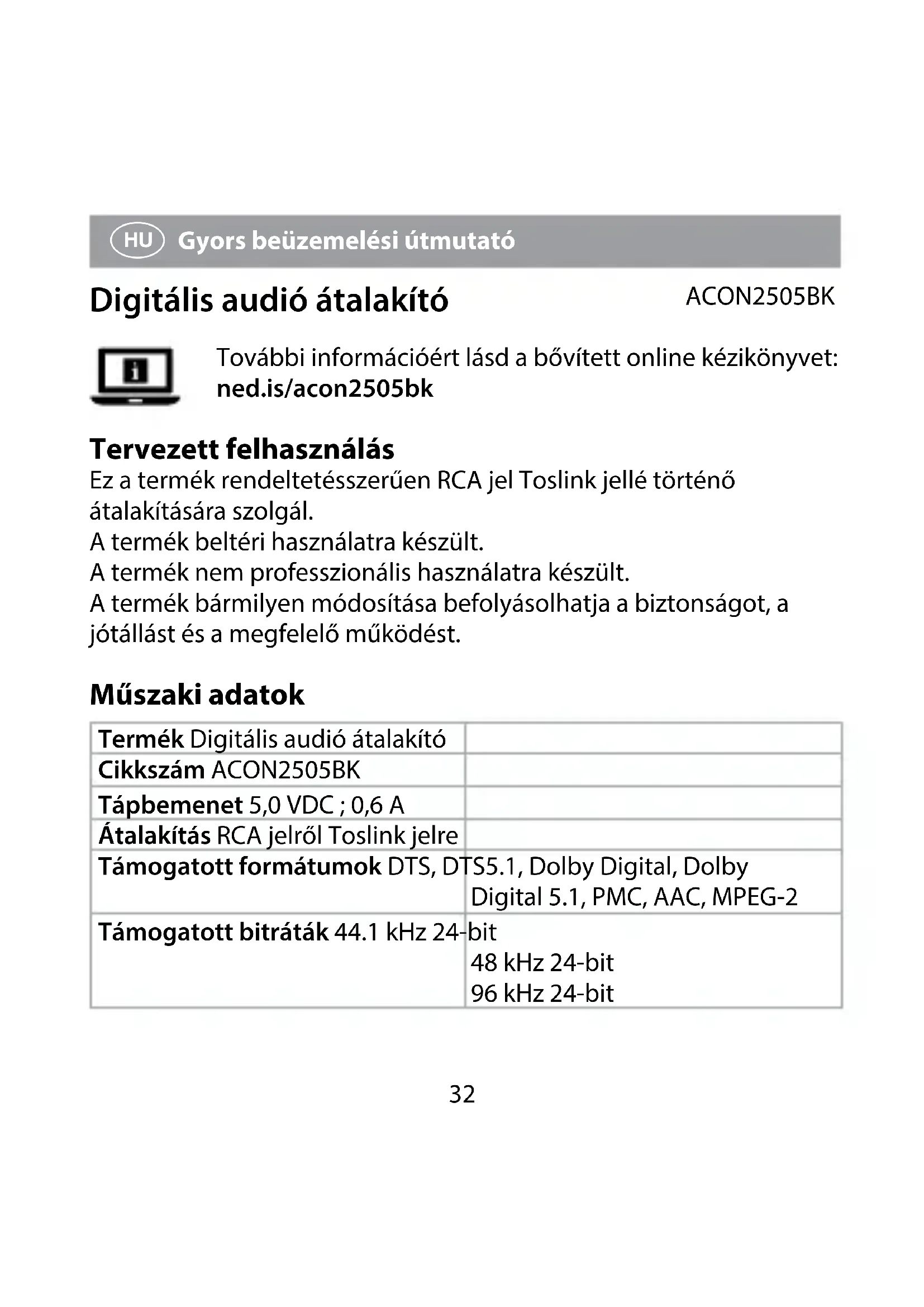 Gyors beüzemelési útmutató Digitális audió átalakító ACON2505BK További információért lásd a bővített online kézikönyvet: ned.is/acon2505bk Tervezett felhasználás Ez a termék rendeltetésszerűen RCA jel Toslink jellé történő átalakítására szolgál. A termék beltéri használatra készült. A termék nem professzionális használatra készült. A termék bármilyen módosítása befolyásolhatja a biztonságot, a jótállást és a megfelelő működést. Műszaki adatok Termék Digitális audió átalakító Cikkszám ACON2505BK Tápbemenet 5,0 VDC ; 0,6 A Átalakítás RCA jelről Toslink jelre Támogatott formátumok DTS, DTS5.1, Dolby Digital, Dolby Digital 5.1, PMC, AAC, MPEG-2 Támogatott bitráták 44.1 kHz 24-bit 48 kHz 24-bit 96 kHz 24-bit33 Fő alkatrészek (A kép)