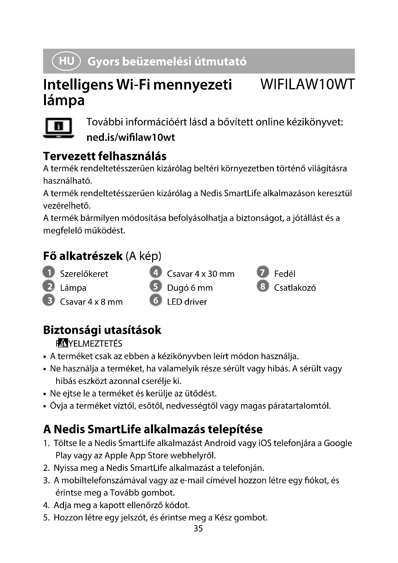 Gyors beüzemelési útmutató Intelligens Wi-Fi mennyezeti lámpa WIFILAW10WT További információért lásd a bővített online kézikönyvet: ned.is/wilaw10wt Tervezett felhasználás A termék rendeltetésszerűen kizárólag beltéri környezetben történő világításra használható.A termék rendeltetésszerűen kizárólag a Nedis SmartLife alkalmazáson keresztül vezérelhető.A termék bármilyen módosítása befolyásolhatja a biztonságot, a jótállást és a megfelelő működést. Fő alkatrészek (A kép)