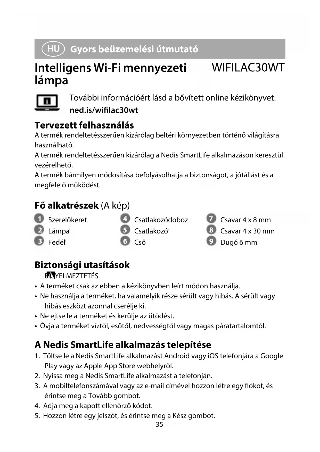Gyors beüzemelési útmutató Intelligens Wi-Fi mennyezeti lámpa WIFILAC30WT További információért lásd a bővített online kézikönyvet: ned.is/wilac30wt Tervezett felhasználás A termék rendeltetésszerűen kizárólag beltéri környezetben történő világításra használható.A termék rendeltetésszerűen kizárólag a Nedis SmartLife alkalmazáson keresztül vezérelhető.A termék bármilyen módosítása befolyásolhatja a biztonságot, a jótállást és a megfelelő működést. Fő alkatrészek (A kép)
