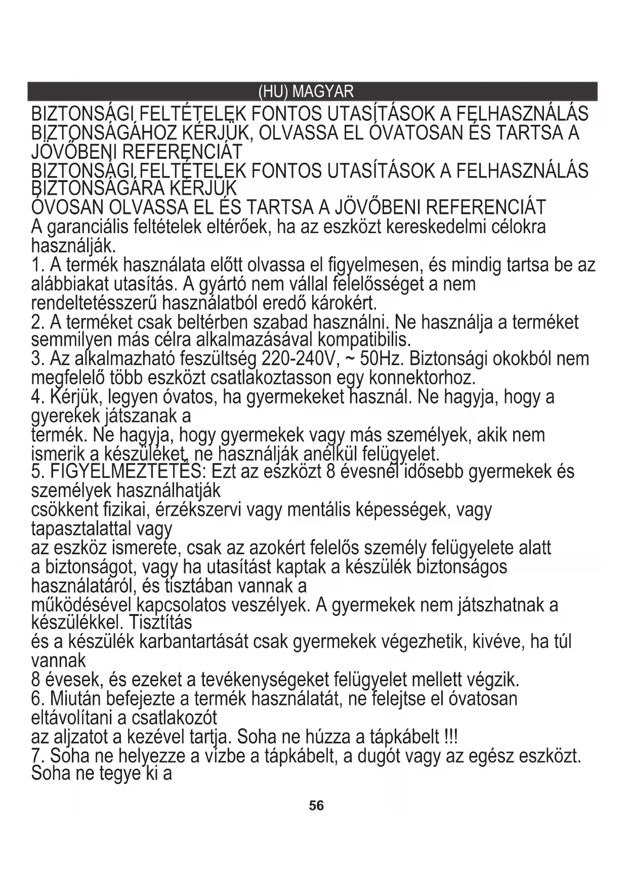 személyek használhatják termék. Ne hagyja, hogy gyermekek vagy más személyek, akik nem ismerik a készüléket, ne használják anélkül felügyelet. az eszköz ismerete, csak az azokért felelős személy felügyelete alatt csökkent fizikai, érzékszervi vagy mentális képességek, vagy tapasztalattal vagy működésével kapcsolatos veszélyek. A gyermekek nem játszhatnak a készülékkel. Tisztítás a biztonságot, vagy ha utasítást kaptak a készülék biztonságos használatáról, és tisztában vannak a és a készülék karbantartását csak gyermekek végezhetik, kivéve, ha túl vannak 8 évesek, és ezeket a tevékenységeket felügyelet mellett végzik.