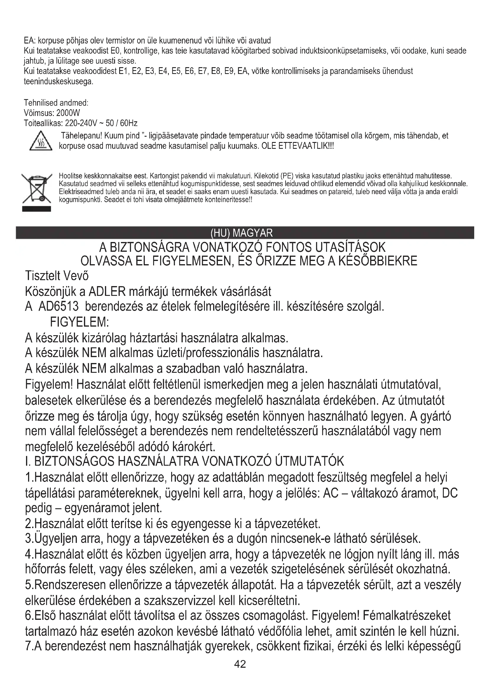 A készülék kizárólag háztartási használatra alkalmas. Tisztelt Vevő Figyelem! Használat előtt feltétlenül ismerkedjen meg a jelen használati útmutatóval, balesetek elkerülése és a berendezés megfelelő használata érdekében. Az útmutatót őrizze meg és tárolja úgy, hogy szükség esetén könnyen használható legyen. A gyártó nem vállal felelősséget a berendezés nem rendeltetésszerű használatából vagy nem megfelelő kezeléséből adódó károkért. 1.Használat előtt ellenőrizze, hogy az adattáblán megadott feszültség megfelel a helyi tápellátási paramétereknek, ügyelni kell arra, hogy a jelölés: AC – váltakozó áramot, DC pedig – egyenáramot jelent. A BIZTONSÁGRA VONATKOZÓ FONTOS UTASÍTÁSOK OLVASSA EL FIGYELMESEN, ÉS ŐRIZZE MEG A KÉSŐBBIEKRE Köszönjük a ADLER márkájú termékek vásárlását A AD6513 berendezés az ételek felmelegítésére ill. készítésére szolgál. FIGYELEM: A készülék NEM alkalmas üzleti/professzionális használatra. 5.Rendszeresen ellenőrizze a tápvezeték állapotát. Ha a tápvezeték sérült, azt a veszély elkerülése érdekében a szakszervizzel kell kicseréltetni. 2.Használat előtt terítse ki és egyengesse ki a tápvezetéket. 6.Első használat előtt távolítsa el az összes csomagolást. Figyelem! Fémalkatrészeket tartalmazó ház esetén azokon kevésbé látható védőfólia lehet, amit szintén le kell húzni. 3.Ügyeljen arra, hogy a tápvezetéken és a dugón nincsenek-e látható sérülések. 4.Használat előtt és közben ügyeljen arra, hogy a tápvezeték ne lógjon nyílt láng ill. más hőforrás felett, vagy éles széleken, ami a vezeték szigetelésének sérülését okozhatná. 7.A berendezést nem használhatják gyerekek, csökkent fizikai, érzéki és lelki képességű (HU) MAGYAR43 17.A gyártó nem vállal felelősséget a berendezés nem megfelelő használatából eredő károkért. 20.SOHA ne takarja le az üzemelő berendezést ill. addig, amíg teljesen le nem hűl. 22 A készülék kialakítása megfelel a II. Védelmi osztály 12.A tápvezeték nem lóghat a munkalap szélén kívül ill. nem érintkezhet forró felületekkel. 16.Amikor kiveszi a dugót a konnektorból, ne a vezetéknél, hanem mindig a dugónál húzza. FIGYELMEZTETÉS: A jelen berendezést 8 éven felüli gyerekek, illetve korlátozott fizikai, érzéki vagy pszichikai képességű személyek, valamint a berendezés kezelése tekintetében tapasztalattal nem rendelkező személyek CSAK akkor használhatják, ha ez a biztonságukért felelős személy felügyelete mellett történik, vagy megismerkedtek a berendezés biztonságos használatára vonatkozó útmutatókkal és tisztában vannak a használatával kapcsolatos veszéllyel. Gyerekek a berendezéssel nem játszhatnak. A berendezés tisztítását és karbantartását gyerekek nem végezhetik, kivéve ha 8 éves kornál idősebbek és ezek a tevékenységek felügyelet mellett történnek. 11.Ne használja a berendezést tűzveszélyes anyagok közelében. 13.Tilos a berendezést ill. a tápvezetéket vízben vagy más folyadékban meríteni. 21.Ne feledje, hogy a berendezés fűtőelemeinek időre van szükség a teljes lehűléshez. 24.ÓVATOSAN KELL ELJÁRNI, ha a berendezést a magas hőmérsékletre érzékeny felületeken használja. Ebben az esetben ajánlott a szigetelő alátétek használata. 26.Fémtárgyakat, mint kést, villát, kanalat vagy fedőt nem szabad a fűtési felületre rakni, mert felmelegedhetnek 23.A berendezés használata során megfelelő teret kell biztosítani felette és körülötte. Üzemelés során a berendezés nem érintkezhet semmilyen tűzveszélyes anyagokkal, mint pl.: dekorációk, papírtörülközők, függöny, ruha, stb. 14.Ne tegye ki a berendezést időjárási tényezők (eső, napsütés, stb.) hatásának és ne használja nagyobb nedvesség tartalmú körülmények között (fürdőszoba, nedves kempingház). 10.Tilos az üzemelő berendezést felügyelet nélkül hagyni. 15.Amikor a berendezést nem használják, mindig le kell kapcsolni hálózati konnektorról. 18.Ügyeljen arra, hogy a berendezés és a ház egyes részei üzemelés során erősen felmelegednek, ezért különös óvatossággal járjon el és ne érintse azokat, az égési sérülések elkerülése érdekében. 25.A berendezés nem alkalmas külső időzítő kapcsolókkal vagy egyéb külön távvezérlő készülékkel való használatra. 19.A berendezést csak száraz és stabil felületen használja. 9.A berendezés kizárólag , 220-240V ~50/60Hz feszültségű konnektorhoz csatlakoztatható. személyek a jogosult vagy tapasztalt személyek jelenléte nélkül, a használat mindig a jelen útmutatónak megfelelően történjen. 8.A berendezés nem alkalmas külső időzítő kapcsolókkal vagy külön távvezérlő készülékkel való használatra.44 28.A készülék befolyásolhatja a mágneses mezővel rendelkező tárgyakat, mint rádió,TV, bankkártya vagy kazetta. 31.A pacemakerrel vagy az inzulinpumpával rendelkező személyek csak indukciós fűtési területekkel működtethetik a készüléket, feltéve, hogy ezek az implantátumok megfelelnek a 2014/30/EU előírásnak. A biztonság növelése érdekében ajánlott, hogy az elektromos hálózat automata differenciál-áram megszakítóval legyen felszerelve, melynek működtető árama 30mA. 27.Ne melegítse az üres edényt.