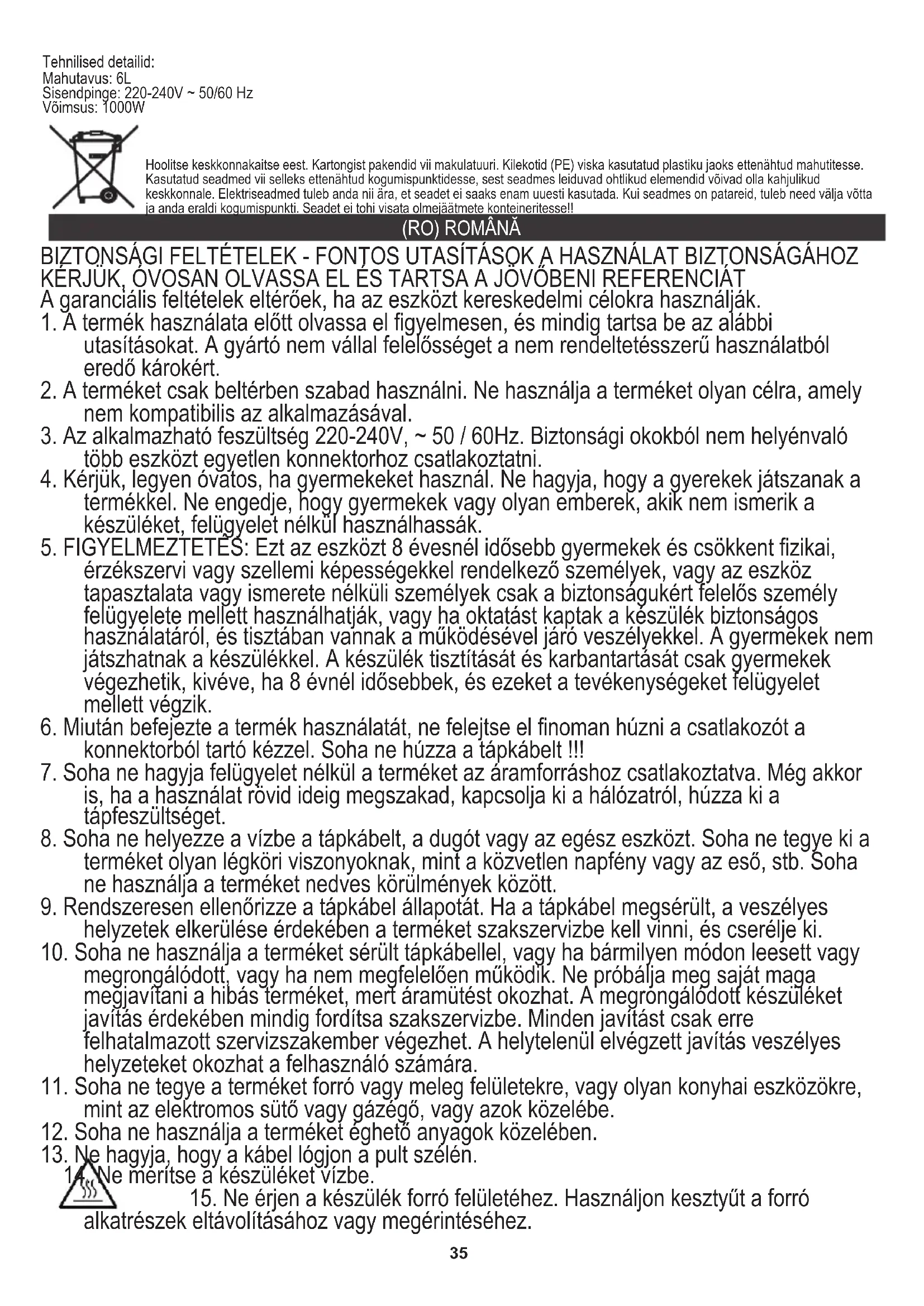 alkatrészek eltávolításához vagy megérintéséhez. Tehnilised detailid: Mahutavus: 6L Sisendpinge: 220-240V ~ 50/60 Hz Võimsus: 1000W36