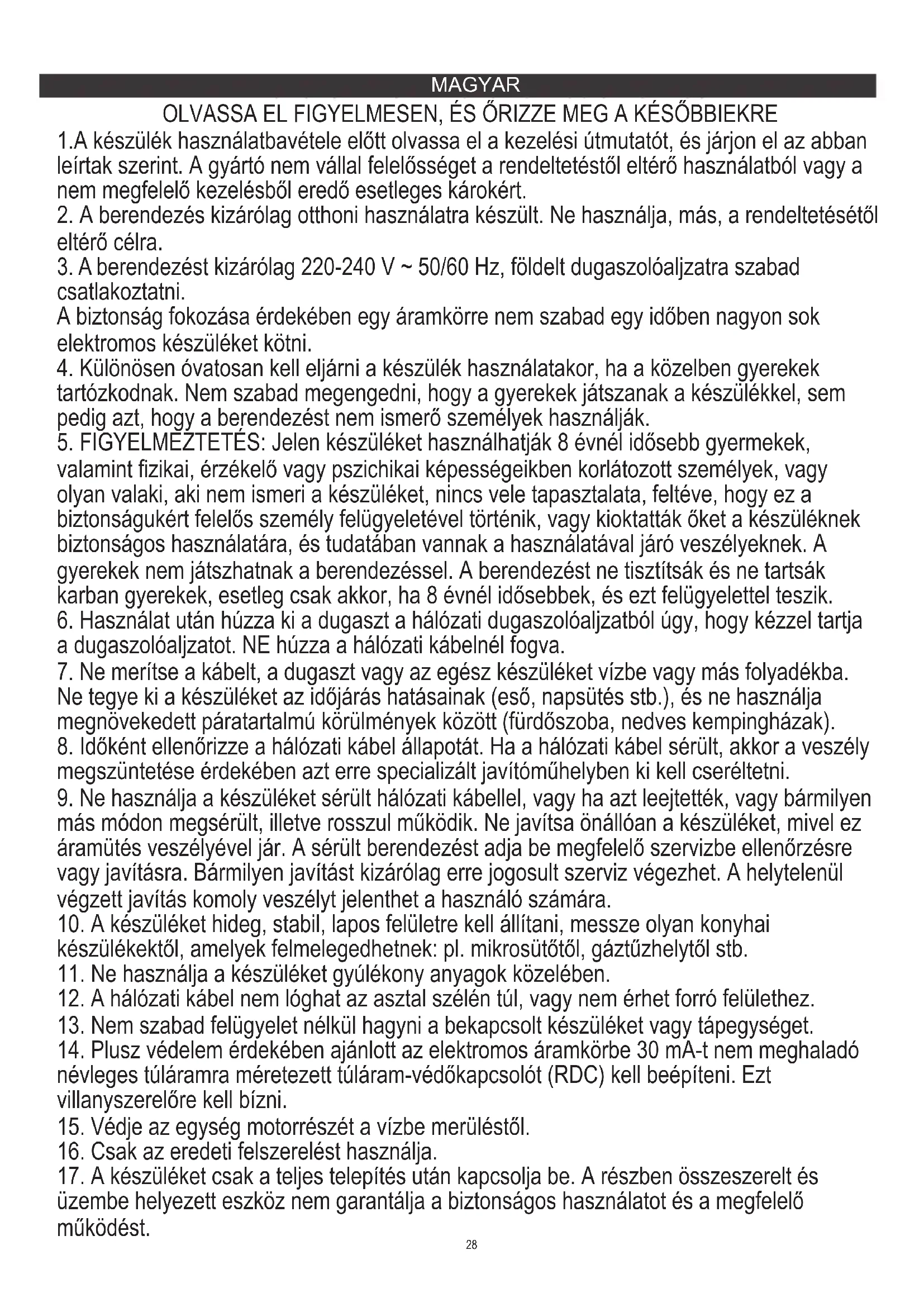 5. FIGYELMEZTETÉS: Jelen készüléket használhatják 8 évnél idősebb gyermekek,