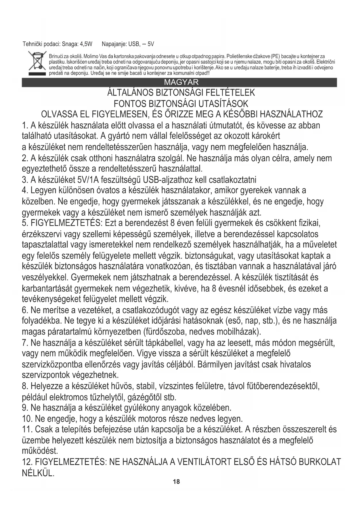 A környezet védelme érdekében kérjük külön karton dobozok és műanyag zsákokat és dobja őket a megfelelő hulladék közé. Használt készüléket kell eljuttatni a kijelölt gyűjtőhelyekre miatt veszélyes elemek alkatrészeket, amelyek hatással lehetnek a környezetre. Ne dobja a készüléket a közös szemétkosárba. SUOMI YLEISET TURVALLISUUSEHDOT