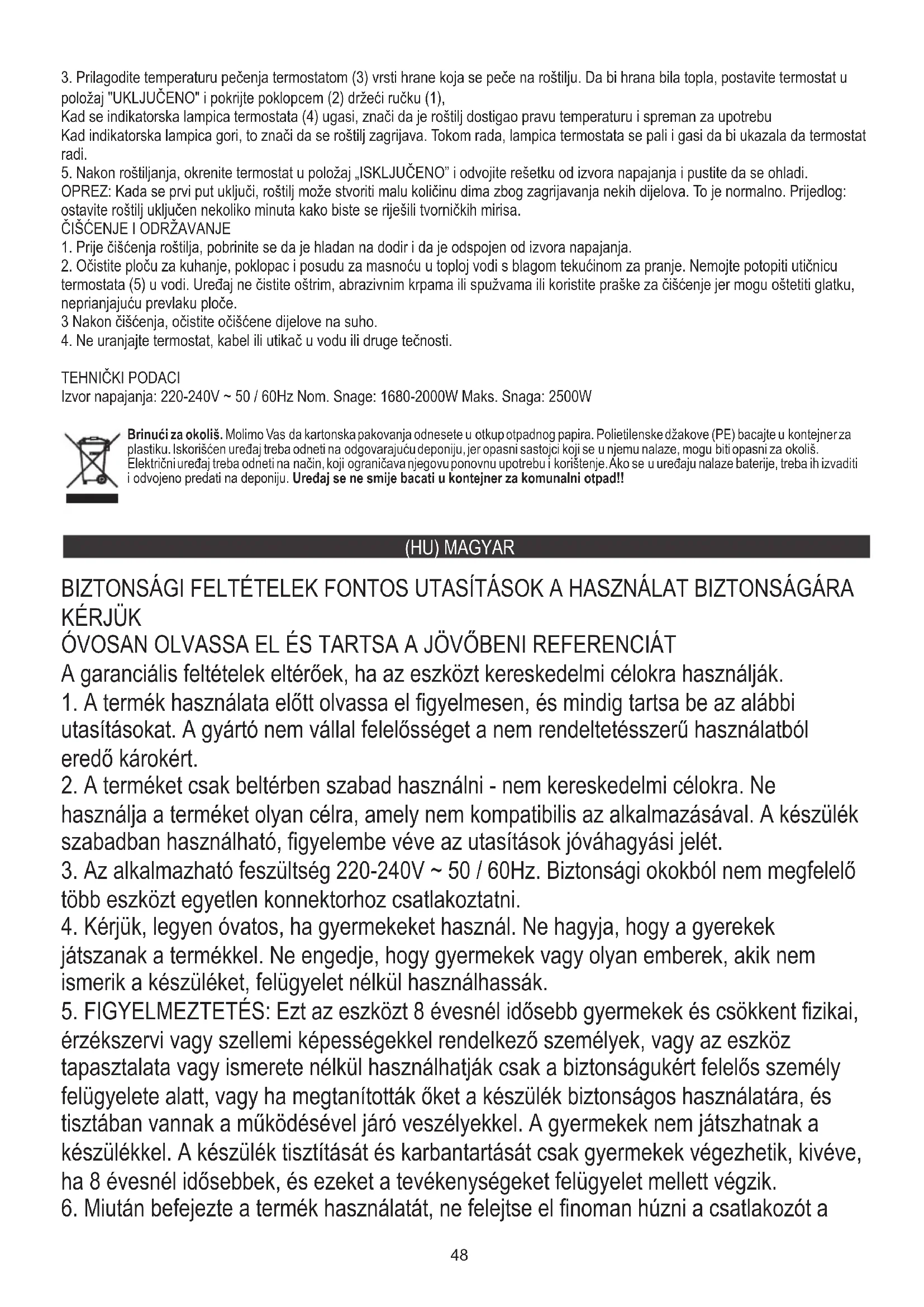 3. Állítsa be a sütési hőmérsékletet a termosztáttal (3) a grillezett ételek típusához. Az ételek melegen tartásához állítsa a termosztátot "ON" helyzetbe, és takarja le a fogantyút (1) tartó fedéllel (2), -Távolítsa el az összes csomagolóanyagot, és mossa meg a grilllemezt (6). Olajgyűjtő tálca (7) és a grill fedele (2) Telepítés után Áramforrás: 220-240V ~ 50 / 60Hz Teljesítmény névleges: 1680-2000W Teljesítmény: 2500W Ha a jelzőfény világít, ez azt jelenti, hogy a grill felmelegszik. Működés közben a termosztát fénye kigyullad, jelezve, hogy a termosztát működik. 2. Tisztítsa meg a főzőlapot, a fedelet és a zsírtartót meleg vízben, enyhe mosogatószerrel. Ne áztassa vízben a termosztát foglalatát (5). Ne tisztítsa a készüléket éles, koptató kendőkkel vagy szivaccsal, és ne használjon tisztítóport, mert ezek károsíthatják a lemez sima, tapadásmentes bevonatát. Figyelem Kérjük, vigyázzon. A készülék üzemeltetése során kerülje a tápkábel általi botlást. Úgy helyezze el a tápkábelt, hogy az el ne kerüljön. Használat után ne felejtse el eltávolítani a dugót. Fontos: Az összes alkatrészt alaposan szárítsa meg. VIGYÁZAT: Az első bekapcsoláskor a grill kis részeket képes füstölni egyes részek felmelegedése miatt. Ez normális. Javaslat: hagyja néhány percig bekapcsolva a grillt, hogy megszabaduljon a gyári szagtól. A készülék első használata előtt Amikor a termosztát jelzőfénye (4) kialszik, ez azt jelenti, hogy a grill elérte a megfelelő hőmérsékletet és használatra kész