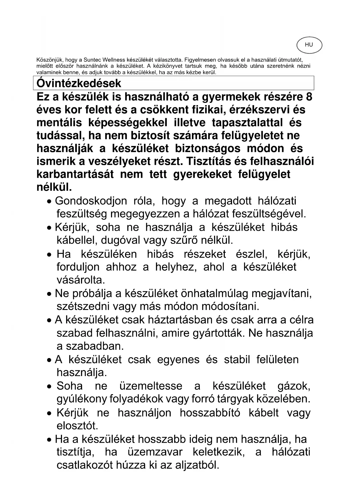 Köszönjük, hogy a Suntec Wellness készülékét választotta. Figyelmesen olvassuk el a használati útmutatót, mielőtt először használnánk a készüléket. A kézikönyvet tartsuk meg, ha később utána szeretnénk nézni valaminek benne, és adjuk tovább a készülékkel, ha az más kézbe kerül. Óvintézkedések Ez a készülék is használható a gyermekek részére 8 éves kor felett és a csökkent fizikai, érzékszervi és mentális képességekkel illetve tapasztalattal és tudással, ha nem biztosít számára felügyeletet ne használják a készüléket biztonságos módon és ismerik a veszélyeket részt. Tisztítás és felhasználói karbantartását nem tett gyerekeket felügyelet nélkül.