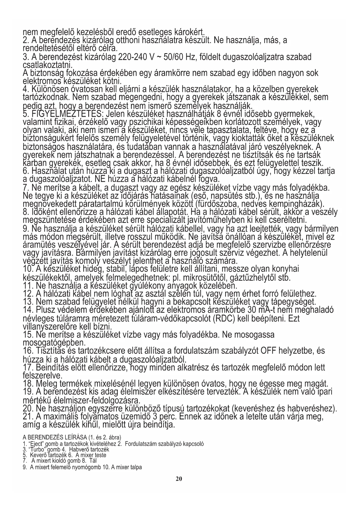 20. Ne használjon egyszerre különböző típusú tartozékokat (keveréshez és habveréshez).