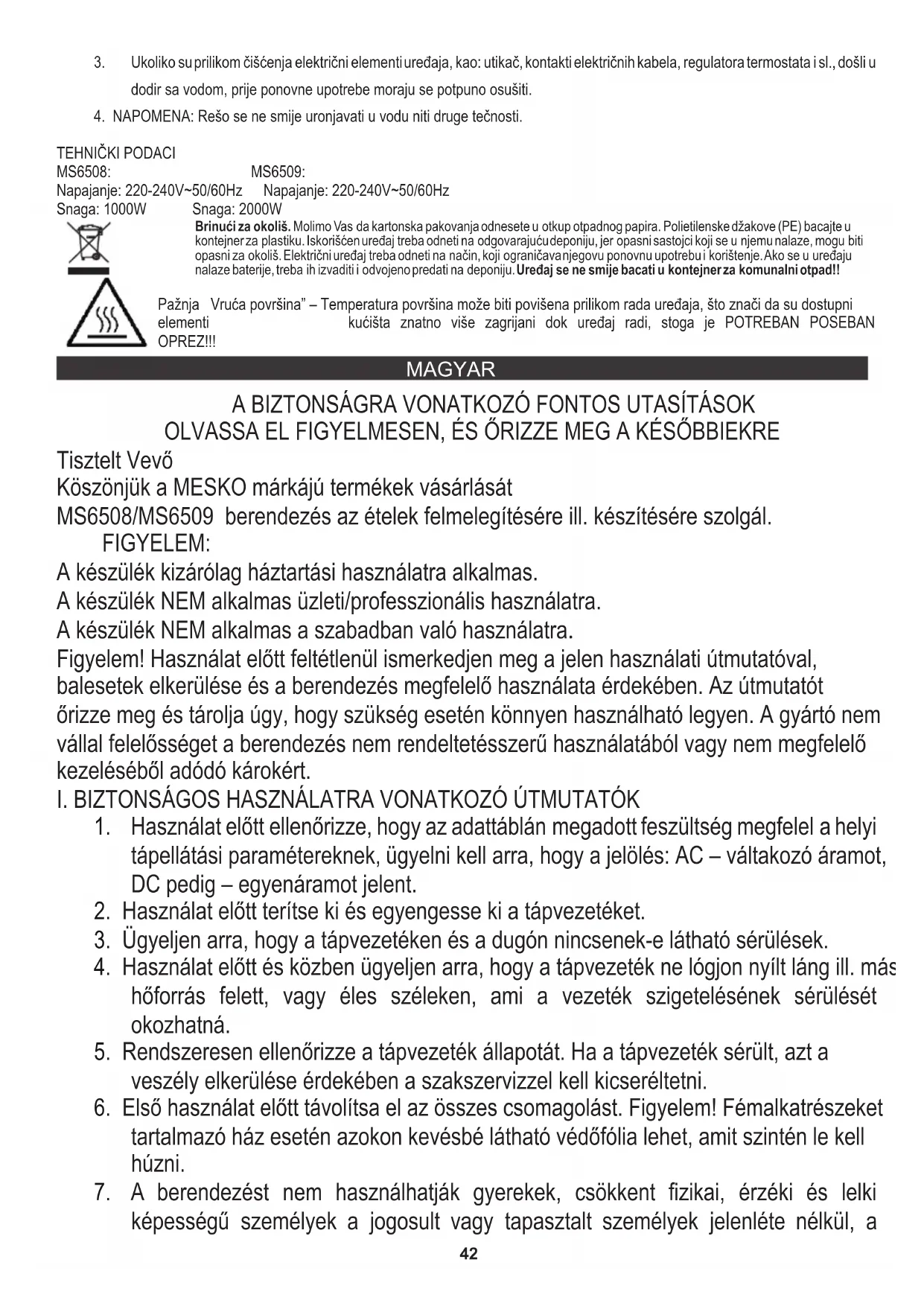 MS6508/MS6509 berendezés az ételek felmelegítésére ill. készítésére szolgál. FIGYELEM: A készülék kizárólag háztartási használatra alkalmas. A BIZTONSÁGRA VONATKOZÓ FONTOS UTASÍTÁSOK