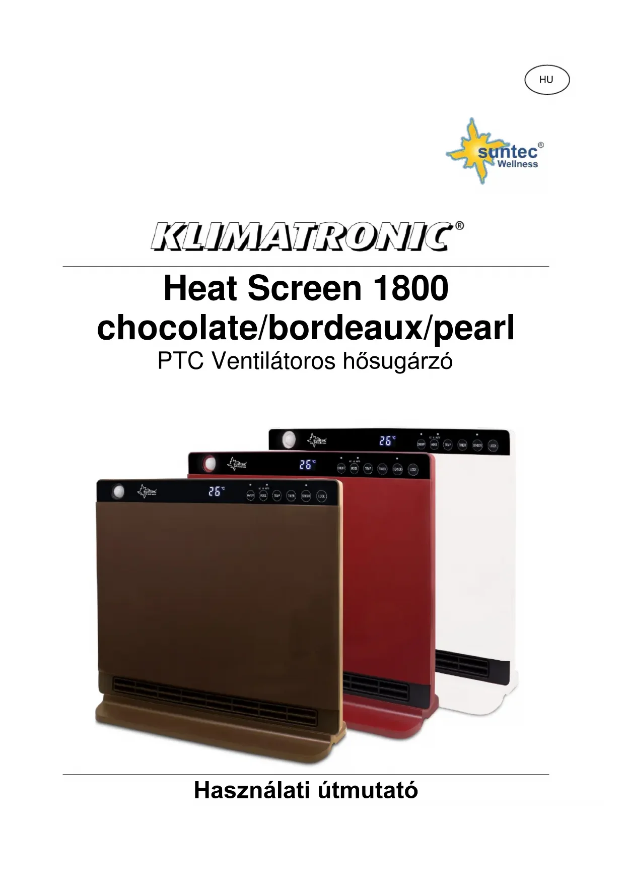 Heat Screen 1800 SUNTEC WELLNESS GMBH / HOLZSTRASSE 2 / 40 221 DÜSSELDORF / GERMANYSE HU Heat Screen 1800 chocolate/bordeaux/pearl PTC Ventilátoros hősugárzó Használati útmutatóKöszönjük, hogy a Suntec Wellness készülékét választotta. Figyelmesen olvassuk el a használati útmutatót, mielőtt először használnánk a készüléket. A kézikönyvet tartsuk meg, ha később utána szeretnénk nézni valaminek benne, és adjuk tovább a készülékkel, ha az más kézbe kerül. Óvintézkedések Ez a készülék is használható a gyermekek részére 8 éves kor felett és a csökkent fizikai, érzékszervi és mentális képességekkel illetve tapasztalattal és tudással, ha nem biztosít számára felügyeletet ne használják a készüléket biztonságos módon és ismerik a veszélyeket részt. Tisztítás és felhasználói karbantartását nem tett gyerekeket felügyelet nélkül. Az állandó felügyelet nélküli 3 év alatti gyermekeket meg kell akadályozni, hogy hozzányúljanak a készülékhez. Három évesnél idősebb, de nyolc évesnél fiatalabb gyermekek a készüléket csak be- és kikapcsolhatják azzal a feltétellel, hogy a készülék a rendes használati helyzetében legyen elhelyezve vagy felszerelve, kioktatták őket a készülék biztonságos használatáról, felügyelet alatt vannak, és a lehetséges veszélyeket megértették. Három évesnél idősebb, de nyolc évesnél fiatalabb gyermekek a készüléket nem dughatják be a konnektorba, nem szabályozhatják, tisztíthatják, és karbantartást sem végezhetnek rajta.