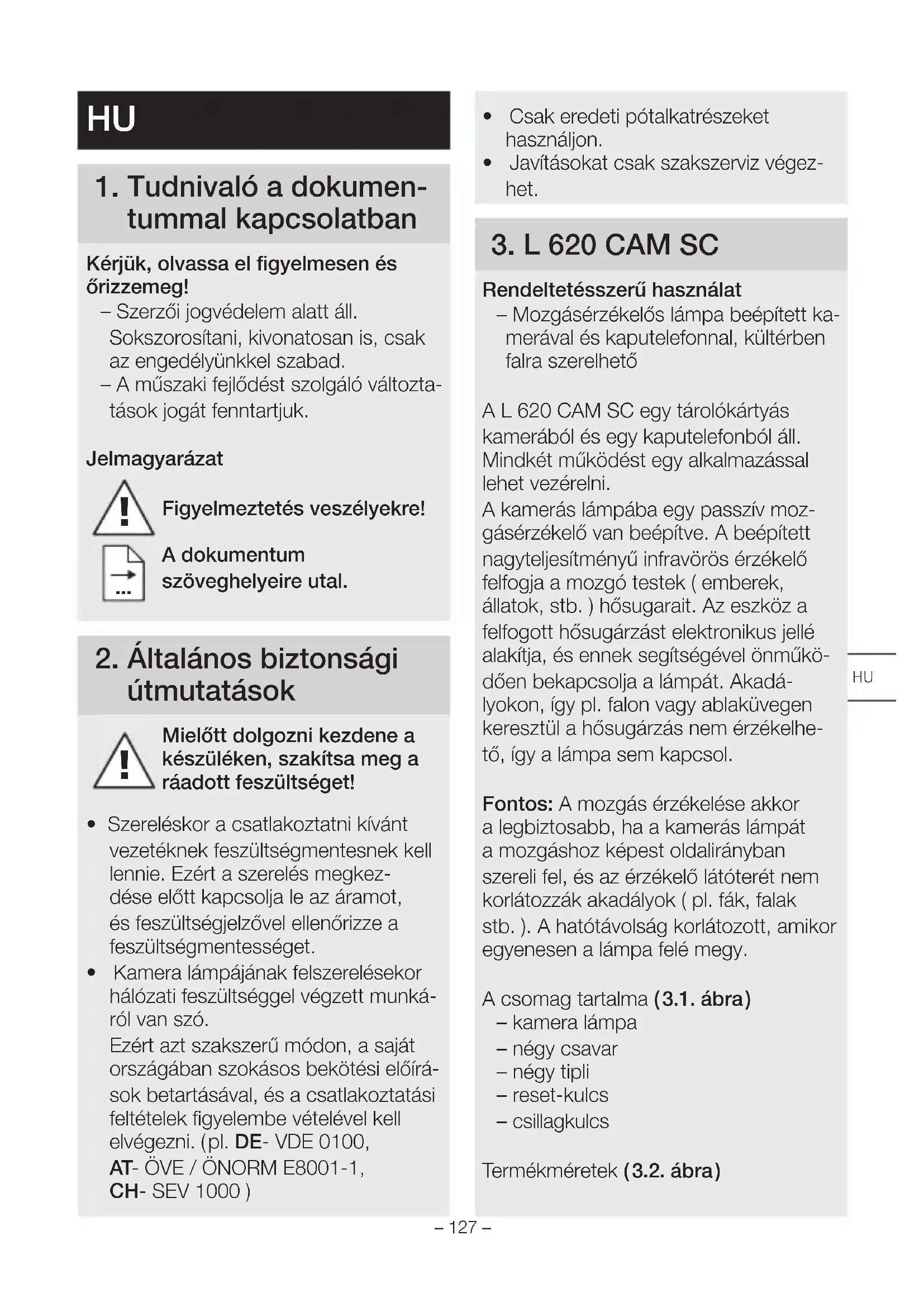 Rendeltetésszerű használat – Mozgásérzékelős lámpa beépített ka- merával és kaputelefonnal, kültérben falra szerelhető A L620CAM SC egy tárolókártyás kamerából és egy kaputelefonból áll. Mindkét működést egy alkalmazással lehet vezérelni. A kamerás lámpába egy passzív moz- gásérzékelő van beépítve. A beépített nagyteljesítményű infravörös érzékelő felfogja a mozgó testek ( emberek, állatok, stb. ) hősugarait. Az eszköz a felfogott hősugárzást elektronikus jellé alakítja, és ennek segítségével önműkö- dően bekapcsolja a lámpát. Akadá- lyokon, így pl. falon vagy ablaküvegen keresztül a hősugárzás nem érzékelhe- tő, így a lámpa sem kapcsol. Fontos: A mozgás érzékelése akkor a legbiztosabb, ha a kamerás lámpát a mozgáshoz képest oldalirányban szereli fel, és az érzékelő látóterét nem korlátozzák akadályok ( pl. fák, falak stb. ). A hatótávolság korlátozott, amikor egyenesen a lámpa felé megy. A csomag tartalma ( 3.1. ábra ) – kamera lámpa – négy csavar – négy tipli – reset-kulcs – csillagkulcs Termékméretek ( 3.2. ábra )
