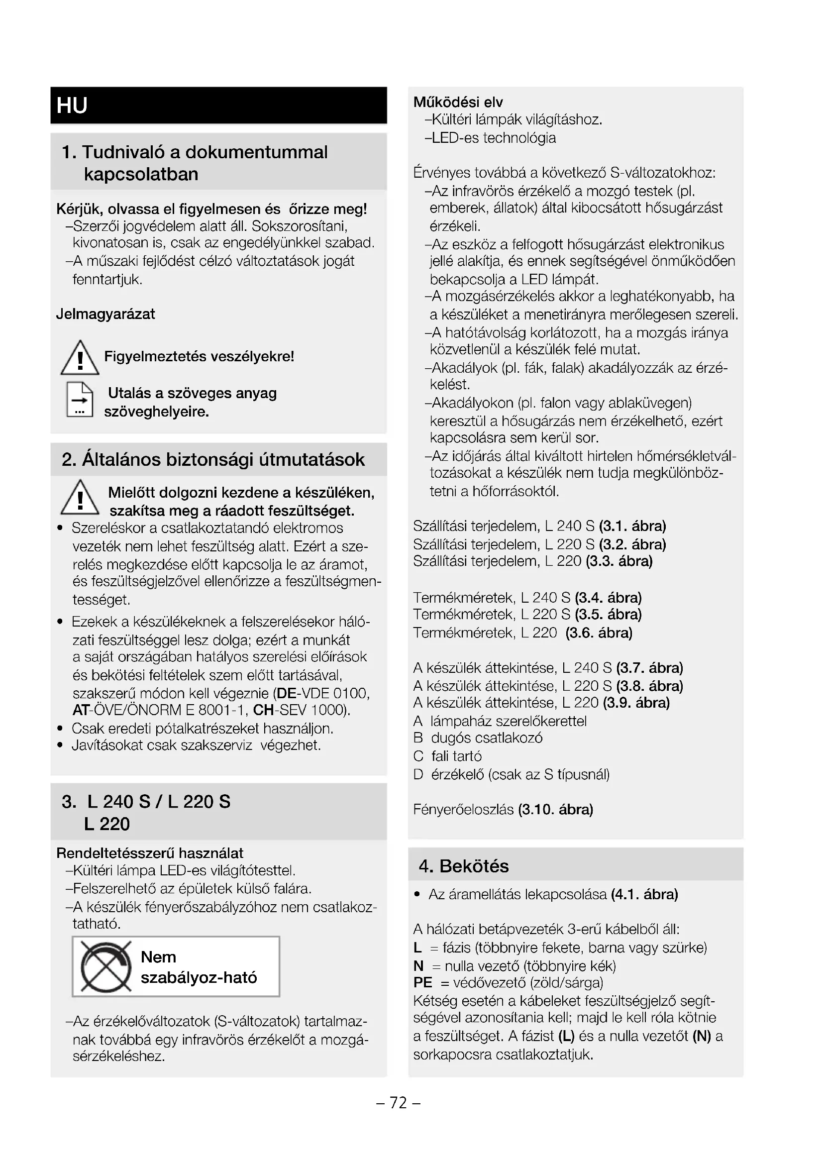 - Az áramellátás lekapcsolása (4.1. ábra) A hálózati betápvezeték 3-erű kábelből áll: L = fázis (többnyire fekete, barna vagy szürke) N = nulla vezető (többnyire kék) PE = védővezető (zöld/sárga) Kétség esetén a kábeleket feszültségjelző segít- ségével azonosítania kell; majd le kell róla kötnie a feszültséget. A fázist (L) és a nulla vezetőt (N) a sorkapocsra csatlakoztatjuk.– 73 – Fontos! A csatlakozások felcserélése később zárlathoz vezet a készülékben vagy az Ön biztosítékdobozában. Ebben az esetben ismét azonosítani kell az egyes kábeleket, és újból össze kell kötni őket. A hálózati betápvezetékbe természetesen beszerelhetnek hálózati kapcsolót is a be- és kikapcsoláshoz. Tudnivaló: Ennek a lámpának a fényforrását csak a gyártó, vagy az általa megbízott szerviz szakember, vagy hasonló képesítésű, szakképzett személy cserélheti le. Hálózati tápvezeték csatlakoztatása (5.6. ábra) L 240 S, L 220 S bekötési rajza (4.2. ábra) L 240 S, L 220 S bekötési rajza (4.3. ábra)