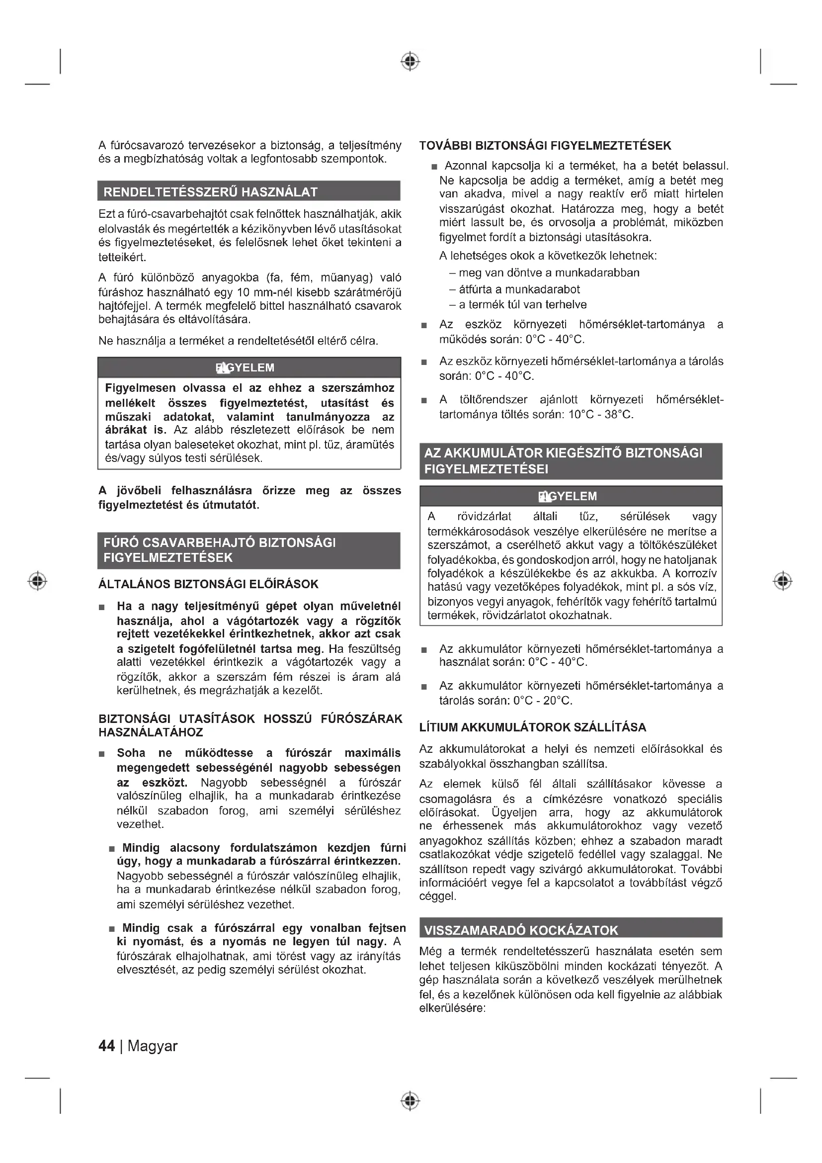 ■ Azonnal kapcsolja ki a terméket, ha a betét belassul. Ne kapcsolja be addig a terméket, amíg a betét meg van akadva, mivel a nagy reaktív erő miatt hirtelen visszarúgást okozhat. Határozza meg, hogy a betét miért lassult be, és orvosolja a problémát, miközben figyelmet fordít a biztonsági utasításokra. A lehetséges okok a következők lehetnek: – meg van döntve a munkadarabban – átfúrta a munkadarabot – a termék túl van terhelve ■ Az eszköz környezeti hőmérséklet-tartománya a működés során: 0°C - 40°C. ■ Az eszköz környezeti hőmérséklet-tartománya a tárolás során: 0°C - 40°C. ■ A töltőrendszer ajánlott környezeti hőmérséklet- tartománya töltés során: 10°C - 38°C. AZ AKKUMULÁTOR KIEGÉSZÍTŐ BIZTONSÁGI FIGYELMEZTETÉSEI FIGYELEM A rövidzárlat általi tűz, sérülések vagy termékkárosodások veszélye elkerülésére ne merítse a szerszámot, a cserélhető akkut vagy a töltőkészüléket folyadékokba, és gondoskodjon arról, hogy ne hatoljanak folyadékok a készülékekbe és az akkukba. A korrozív hatású vagy vezetőképes folyadékok, mint pl. a sós víz, bizonyos vegyi anyagok, fehérítők vagy fehérítő tartalmú termékek, rövidzárlatot okozhatnak. ■ Az akkumulátor környezeti hőmérséklet-tartománya a használat során: 0°C - 40°C. ■ Az akkumulátor környezeti hőmérséklet-tartománya a tárolás során: 0°C - 20°C. LÍTIUM AKKUMULÁTOROK SZÁLLÍTÁSA Az akkumulátorokat a helyi és nemzeti előírásokkal és szabályokkal összhangban szállítsa. Az elemek külső fél általi szállításakor kövesse a csomagolásra és a címkézésre vonatkozó speciális előírásokat. Ügyeljen arra, hogy az akkumulátorok ne érhessenek más akkumulátorokhoz vagy vezető anyagokhoz szállítás közben; ehhez a szabadon maradt csatlakozókat védje szigetelő fedéllel vagy szalaggal. Ne szállítson repedt vagy szivárgó akkumulátorokat. További információért vegye fel a kapcsolatot a továbbítást végző céggel.
