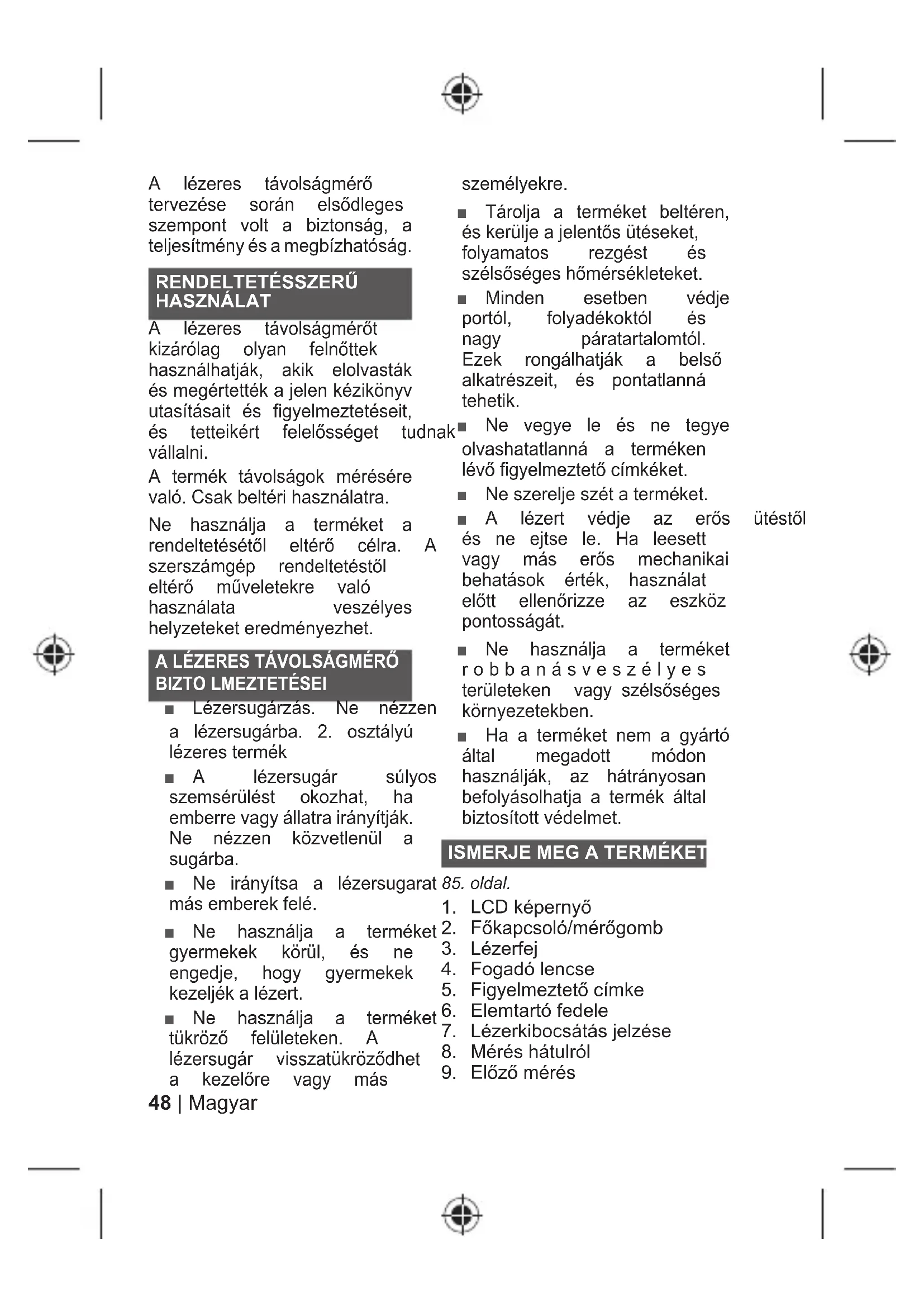 Ŷ Lézersugárzás. Ne nézzen a lézersugárba. 2. osztályú lézeres termék Ŷ A lézersugár súlyos szemsérülést okozhat, ha emberre vagy állatra irányítják. Ne nézzen közvetlenül a sugárba. Ŷ Ne irányítsa a lézersugarat más emberek felé. Ŷ Ne használja a terméket gyermekek körül, és ne engedje, hogy gyermekek kezeljék a lézert. Ŷ Ne használja a terméket WNU|]Ę IHOOHWHNHQ $ Op]HUVXJiU YLVV]DWNU|]ĘGKHW D NH]HOĘUH YDJ\ PiV személyekre. Ŷ Tárolja a terméket beltéren, pVNHUOMHDMHOHQWĘVWpVHNHW folyamatos rezgést és V]pOVĘVpJHVKĘPpUVpNOHWHNHW Ŷ Minden esetben védje portól, folyadékoktól és nagy páratartalomtól. (]HN URQJiOKDWMiN D EHOVĘ alkatrészeit, és pontatlanná tehetik. Ŷ Ne vegye le és ne tegye olvashatatlanná a terméken OpYĘILJ\HOPH]WHWĘFtPNpNHW Ŷ Ne szerelje szét a terméket. Ŷ $ Op]HUW YpGMH D] HUĘV WpVWĘO és ne ejtse le. Ha leesett YDJ\ PiV HUĘV PHFKDQLNDL behatások érték, használat HOĘWW HOOHQĘUL]]H D] HV]N|] pontosságát. Ŷ Ne használja a terméket robbanásveszélyes WHUOHWHNHQ YDJ\ V]pOVĘVpJHV környezetekben. Ŷ Ha a terméket nem a gyártó által megadott módon használják, az hátrányosan befolyásolhatja a termék által biztosított védelmet.