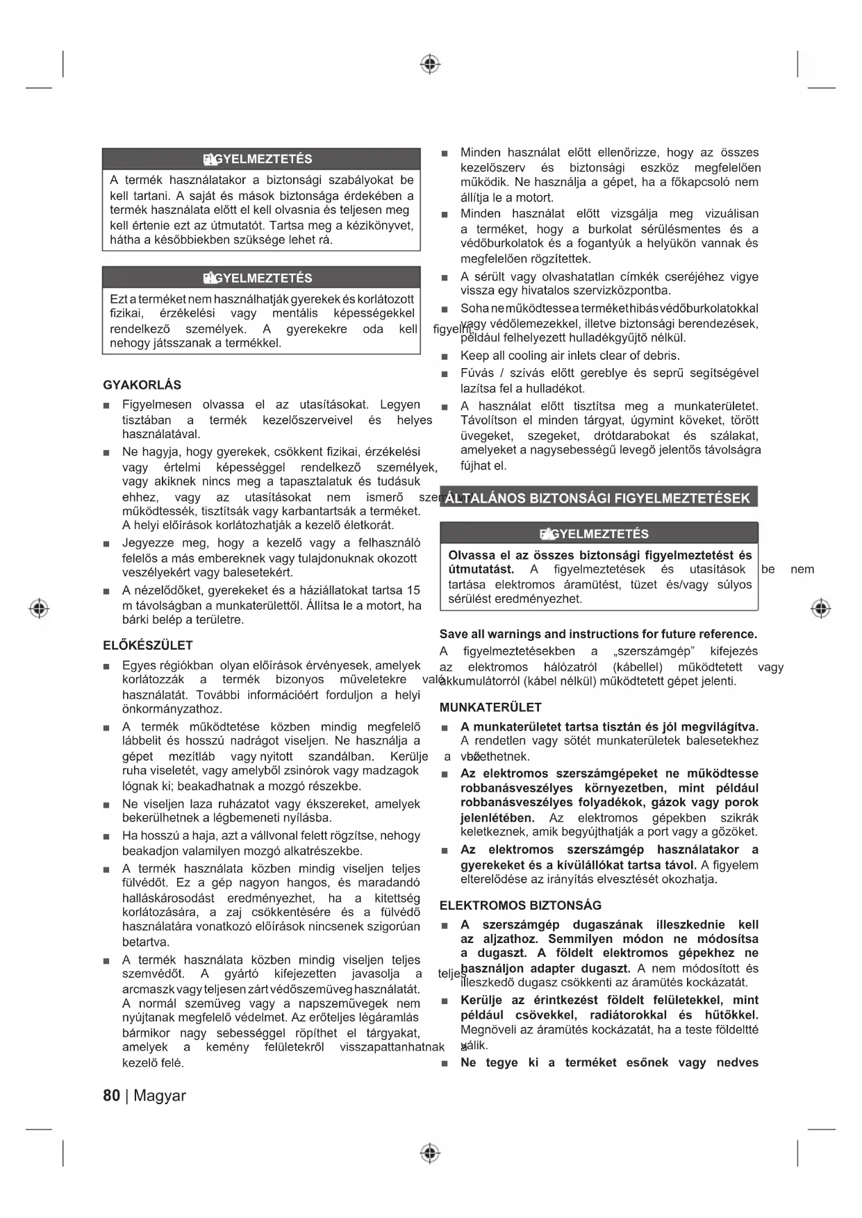 Zapojení do elektrické zásuvky 2GSRMHQtRGHOHNWULFNpVtWČ POZNÁMKA: Varování! 1iVOHGXMtFt VLJQiOQt VORYD D Yê]QDP\ MVRX YKRGQp SUR Y\VYČWOHQt~URYQtQHEH]SHþtVSRMHQêFKVWtPWRYêURENHP 1(%(=3(ýË 2]QDþXMH EH]SURVWĜHGQČ UL]LNRYRX VLWXDFL NWHUp MH WĜHED SĜHGHMtW MLQDNEXGHMHMtP QiVOHGNHP VPUWQHER YiåQp]UDQČQt VAROVÁNÍ 2]QDþXMH PRåQRX UL]LNRYRX VLWXDFL NWHUp MH WĜHED SĜHGHMtW MLQDN MHMtP QiVOHGNHP PĤåH EêW VPUW QHER YiåQp]UDQČQt VAROVÁNÍ 2]QDþXMH PRåQRX UL]LNRYRX VLWXDFL NWHUp MH WĜHED SĜHGHMtW MLQDN MHMtP QiVOHGNHP PĤåH EêW VPUW QHER YiåQp]UDQČQt VAROVÁNÍ %H]V\PEROXEH]SHþQRVWQtYêVWUDK\ 8UþXMH VLWXDFL NWHUi PĤåH PtW ]D QiVOHGHN YiåQp SRãNR]HQt80 | Magyar FIGYELMEZTETÉS A termék használatakor a biztonsági szabályokat be kell tartani. A saját és mások biztonsága érdekében a WHUPpNKDV]QiODWDHOĘWWHONHOOROYDVQLDpVWHOMHVHQPHJ kell értenie ezt az útmutatót. Tartsa meg a kézikönyvet, KiWKDDNpVĘEELHNEHQV]NVpJHOHKHWUi FIGYELMEZTETÉS Ezt a terméket nem használhatják gyerekek és korlátozott ¿]LNDL pU]pNHOpVL YDJ\ PHQWiOLV NpSHVVpJHNNHO UHQGHONH]Ę V]HPpO\HN $ J\HUHNHNUH RGD NHOO ¿J\HOQL nehogy játsszanak a termékkel. GYAKORLÁS Ŷ Figyelmesen olvassa el az utasításokat. Legyen WLV]WiEDQ D WHUPpN NH]HOĘV]HUYHLYHO pV KHO\HV használatával. Ŷ Ne hagyja, hogy gyerekek, csökkent fizikai, érzékelési YDJ\ pUWHOPL NpSHVVpJJHO UHQGHONH]Ę V]HPpO\HN vagy akiknek nincs meg a tapasztalatuk és tudásuk HKKH] YDJ\ D] XWDVtWiVRNDW QHP LVPHUĘ V]HPpO\HN PĦN|GWHVVpNWLV]WtWViNYDJ\NDUEDQWDUWViNDWHUPpNHW $KHO\LHOĘtUiVRNNRUOiWR]KDWMiNDNH]HOĘpOHWNRUiW Ŷ -HJ\H]]H PHJ KRJ\ D NH]HOĘ YDJ\ D IHOKDV]QiOy IHOHOĘVDPiVHPEHUHNQHNYDJ\WXODMGRQXNQDNRNR]RWW veszélyekért vagy balesetekért. Ŷ $Qp]HOĘGĘNHWJ\HUHNHNHWpVDKi]LiOODWRNDWWDUWVD PWiYROViJEDQDPXQNDWHUOHWWĘOÈOOtWVDOHDPRWRUWKD bárki belép a területre. (/ė.e6=h/(7 Ŷ (J\HVUpJLyNEDQRO\DQHOĘtUiVRNpUYpQ\HVHNDPHO\HN NRUOiWR]]iN D WHUPpN EL]RQ\RV PĦYHOHWHNUH YDOy használatát. További információért forduljon a helyi önkormányzathoz. Ŷ $ WHUPpN PĦN|GWHWpVH N|]EHQ PLQGLJ PHJIHOHOĘ lábbelit és hosszú nadrágot viseljen. Ne használja a JpSHW PH]tWOiE YDJ\Q\LWRWW V]DQGiOEDQ .HUOMH D EĘ UXKDYLVHOHWpWYDJ\DPHO\EĘO]VLQyURNYDJ\PDG]DJRN lógnak ki; beakadhatnak a mozgó részekbe. Ŷ Ne viseljen laza ruházatot vagy ékszereket, amelyek bekerülhetnek a légbemeneti nyílásba. Ŷ Ha hosszú a haja, azt a vállvonal felett rögzítse, nehogy beakadjon valamilyen mozgó alkatrészekbe. Ŷ A termék használata közben mindig viseljen teljes IOYpGĘW (] D JpS QDJ\RQ KDQJRV pV PDUDGDQGy halláskárosodást eredményezhet, ha a kitettség NRUOiWR]iViUD D ]DM FV|NNHQWpVpUH pV D IOYpGĘ KDV]QiODWiUDYRQDWNR]yHOĘtUiVRNQLQFVHQHNV]LJRU~DQ betartva. Ŷ A termék használata közben mindig viseljen teljes V]HPYpGĘW $ J\iUWy NLIHMH]HWWHQ MDYDVROMD D WHOMHV DUFPDV]NYDJ\WHOMHVHQ]iUWYpGĘV]HPYHJKDV]QiODWiW A normál szemüveg vagy a napszemüvegek nem Q\~MWDQDNPHJIHOHOĘYpGHOPHW$]HUĘWHOMHVOpJiUDPOiV bármikor nagy sebességgel röpíthet el tárgyakat, DPHO\HN D NHPpQ\ IHOOHWHNUĘO YLVV]DSDWWDQKDWQDN D NH]HOĘIHOp Ŷ 0LQGHQ KDV]QiODW HOĘWW HOOHQĘUL]]H KRJ\ D] |VV]HV NH]HOĘV]HUY pV EL]WRQViJL HV]N|] PHJIHOHOĘHQ PĦN|GLN1HKDV]QiOMDDJpSHWKDDIĘNDSFVROyQHP állítja le a motort. Ŷ 0LQGHQ KDV]QiODW HOĘWW YL]VJiOMD PHJ YL]XiOLVDQ a terméket, hogy a burkolat sérülésmentes és a YpGĘEXUNRODWRNpVDIRJDQW\~NDKHO\N|QYDQQDNpV PHJIHOHOĘHQU|J]tWHWWHN Ŷ A sérült vagy olvashatatlan címkék cseréjéhez vigye vissza egy hivatalos szervizközpontba. Ŷ 6RKDQHPĦN|GWHVVHDWHUPpNHWKLEiVYpGĘEXUNRODWRNNDO YDJ\YpGĘOHPH]HNNHOLOOHWYHEL]WRQViJLEHUHQGH]pVHN SpOGiXOIHOKHO\H]HWWKXOODGpNJ\ĦMWĘQpONO Ŷ Keep all cooling air inlets clear of debris. Ŷ )~YiV V]tYiV HOĘWW JHUHEO\H pV VHSUĦ VHJtWVpJpYHO lazítsa fel a hulladékot. Ŷ $ KDV]QiODW HOĘWW WLV]WtWVD PHJ D PXQNDWHUOHWHW Távolítson el minden tárgyat, úgymint köveket, törött üvegeket, szegeket, drótdarabokat és szálakat, DPHO\HNHWDQDJ\VHEHVVpJĦOHYHJĘMHOHQWĘVWiYROViJUD fújhat el.