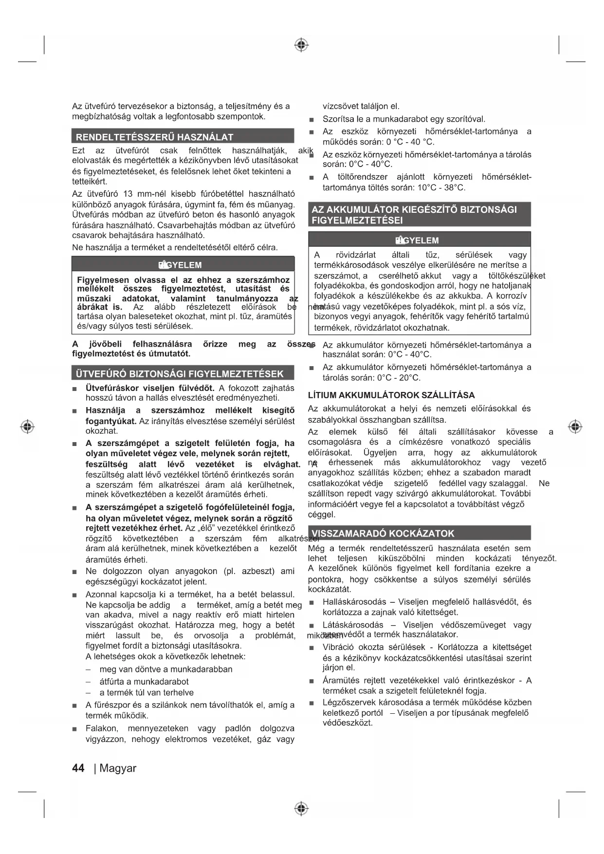 Ŷ hWYHI~UiVNRU YLVHOMHQ IOYpGĘW $ IRNR]RWW ]DMKDWiV hosszú távon a hallás elvesztését eredményezheti. Ŷ +DV]QiOMD D V]HUV]iPKR] PHOOpNHOW NLVHJtWĘ fogantyúkat. Az irányítás elvesztése személyi sérülést okozhat. Ŷ A szerszámgépet a szigetelt felületén fogja, ha RO\DQPĦYHOHWHWYpJH]YHOHPHO\QHNVRUiQUHMWHWW IHV]OWVpJ DODWW OpYĘ YH]HWpNHW LV HOYiJKDW A IHV]OWVpJDODWWOpYĘYH]WpNNHOW|UWpQĘpULQWNH]pVVRUiQ a szerszám fém alkatrészei áram alá kerülhetnek, PLQHNN|YHWNH]WpEHQDNH]HOĘWiUDPWpVpUKHWL Ŷ $V]HUV]iPJpSHWDV]LJHWHOĘIRJyIHOOHWHLQpOIRJMD KDRO\DQPĦYHOHWHWYpJH]PHO\QHNVRUiQDU|J]tWĘ rejtett vezetékhez érhet.$]ÄpOĘ´YH]HWpNNHOpULQWNH]Ę U|J]tWĘ N|YHWNH]WpEHQ D V]HUV]iP IpP DONDWUpV]HL iUDPDOiNHUOKHWQHNPLQHNN|YHWNH]WpEHQD NH]HOĘW áramütés érheti. Ŷ Ne dolgozzon olyan anyagokon (pl. azbeszt) ami HJpV]VpJJ\LNRFNi]DWRWMHOHQW Ŷ $]RQQDONDSFVROMD NL DWHUPpNHWKDD EHWpW EHODVVXO 1HNDSFVROMDEHDGGLJ D WHUPpNHWDPtJDEHWpWPHJ YDQ DNDGYD PLYHO D QDJ\ UHDNWtY HUĘ PLDWW KLUWHOHQ visszarúgást okozhat. Határozza meg, hogy a betét PLpUW ODVVXOW EH pV RUYRVROMD D SUREOpPiW PLN|]EHQ figyelmet fordít a biztonsági utasításokra. $OHKHWVpJHVRNRNDN|YHWNH]ĘNOHKHWQHN – meg van döntve a munkadarabban – átfúrta a munkadarabot – a termék túl van terhelve Ŷ $IĦUpV]SRUpVDV]LOiQNRNQHPWiYROtWKDWyNHODPtJD WHUPpNPĦN|GLN Ŷ Falakon, mennyezeteken vagy padlón dolgozva vigyázzon, nehogy elektromos vezetéket, gáz vagy Yt]FV|YHWWDOiOMRQHO Ŷ Szorítsa le a munkadarabot egy szorítóval. Ŷ $] HV]N|] N|UQ\H]HWL KĘPpUVpNOHWWDUWRPiQ\D D PĦN|GpVVRUiQ&& Ŷ $]HV]N|]N|UQ\H]HWLKĘPpUVpNOHWWDUWRPiQ\DDWiUROiV VRUiQ&& Ŷ $ W|OWĘUHQGV]HU DMiQORWW N|UQ\H]HWL KĘPpUVpNOHW tartománya töltés során: 10°C - 38°C. $=$..808/È725.,(*e6=Ë7ė%,=7216È*, FIGYELMEZTETÉSEI FIGYELEM $ U|YLG]iUODW iOWDOL WĦ] VpUOpVHN YDJ\ termékkárosodások veszélye elkerülésére ne merítse a V]HUV]iPRWD FVHUpOKHWĘDNNXW YDJ\D W|OWĘNpV]OpNHW IRO\DGpNRNEDpVJRQGRVNRGMRQDUUyOKRJ\QHKDWROMDQDN folyadékok a készülékekbe és az akkukba. A korrozív KDWiV~YDJ\YH]HWĘNpSHVIRO\DGpNRNPLQWSODVyVYt] EL]RQ\RVYHJ\LDQ\DJRNIHKpUtWĘNYDJ\IHKpUtWĘWDUWDOP~ termékek, rövidzárlatot okozhatnak. Ŷ $] DNNXPXOiWRU N|UQ\H]HWL KĘPpUVpNOHWWDUWRPiQ\D D KDV]QiODWVRUiQ&& Ŷ $] DNNXPXOiWRU N|UQ\H]HWL KĘPpUVpNOHWWDUWRPiQ\D D WiUROiVVRUiQ&& LÍTIUM AKKUMULÁTOROK SZÁLLÍTÁSA $] DNNXPXOiWRURNDW D KHO\L pV QHP]HWL HOĘtUiVRNNDO pV szabályokkal összhangban szállítsa. $] HOHPHN NOVĘ IpO iOWDOL V]iOOtWiVDNRU N|YHVVH D csomagolásra és a címkézésre vonatkozó speciális HOĘtUiVRNDW hJ\HOMHQ DUUD KRJ\ D] DNNXPXOiWRURN QH pUKHVVHQHN PiV DNNXPXOiWRURNKR] YDJ\ YH]HWĘ anyagokhoz szállítás közben; ehhez a szabadon maradt FVDWODNR]yNDWYpGMH V]LJHWHOĘ IHGpOOHOYDJ\V]DODJJDO 1H szállítson repedt vagy szivárgó akkumulátorokat. További LQIRUPiFLypUWYHJ\HIHODNDSFVRODWRWDWRYiEEtWiVWYpJ]Ę céggel.